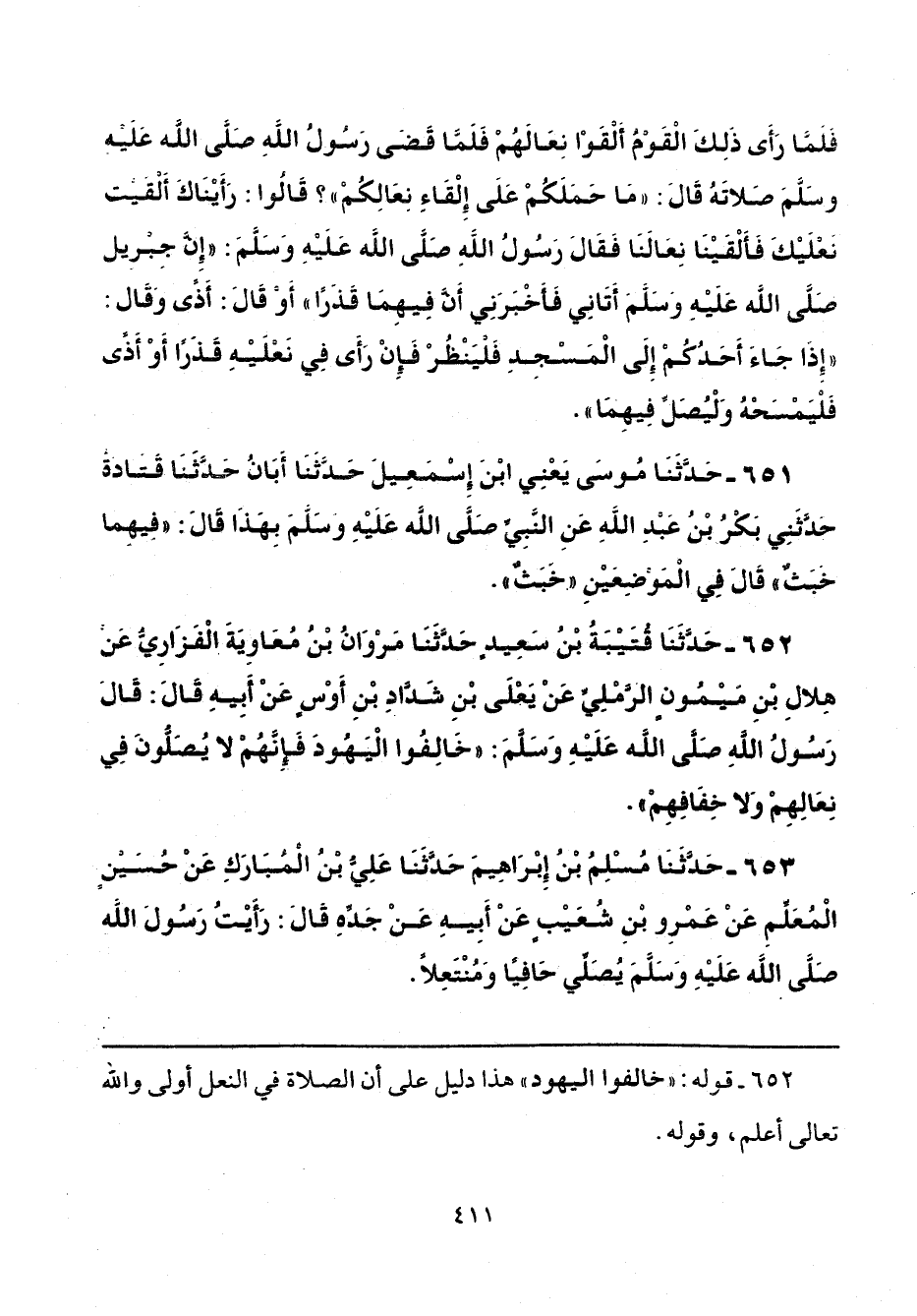 653 - حَدَّثَنَا مُسْلِمُ بْنُ إِبْرَاهِيمَ، حَدَّثَنَا عَلِيُّ بْنُ الْمُبَارَكِ، عَنْ حُسَيْنٍ الْمُعَلِّمِ، عَنْ عَمْرِو بْنِ شُعَيْبٍ، عَنْ أَبِيهِ، عَنْ جَدِّهِ، قَالَ: رَأَيْتُ رَسُولَ اللَّهِ صَلَّى اللهُ عَلَيْهِ وَسَلَّمَ «يُصَلِّي حَافِيًا وَمُنْتَعِلًا».