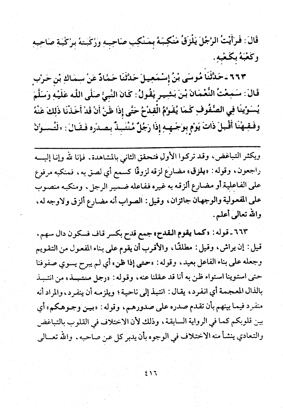 663 - حَدَّثَنَا مُوسَى بْنُ إِسْمَاعِيلَ، حَدَّثَنَا حَمَّادٌ، عَنْ سِمَاكِ بْنِ حَرْبٍ، قَالَ: سَمِعْتُ النُّعْمَانَ بْنَ بَشِيرٍ، يَقُولُ: كَانَ النَّبِيُّ صَلَّى اللهُ عَلَيْهِ وَسَلَّمَ يُسَوِّينَا فِي الصُّفُوفِ كَمَا يُقَوَّمُ الْقِدْحُ حَتَّى إِذَا ظَنَّ أَنْ قَدْ أَخَذْنَا ذَلِكَ عَنْهُ، وَفَقِهْنَا أَقْبَلَ ذَاتَ يَوْمٍ بِوَجْهِهِ إِذَا رَجُلٌ مُنْتَبِذٌ بِصَدْرِهِ، فَقَالَ: «لَتُسَوُّنَّ