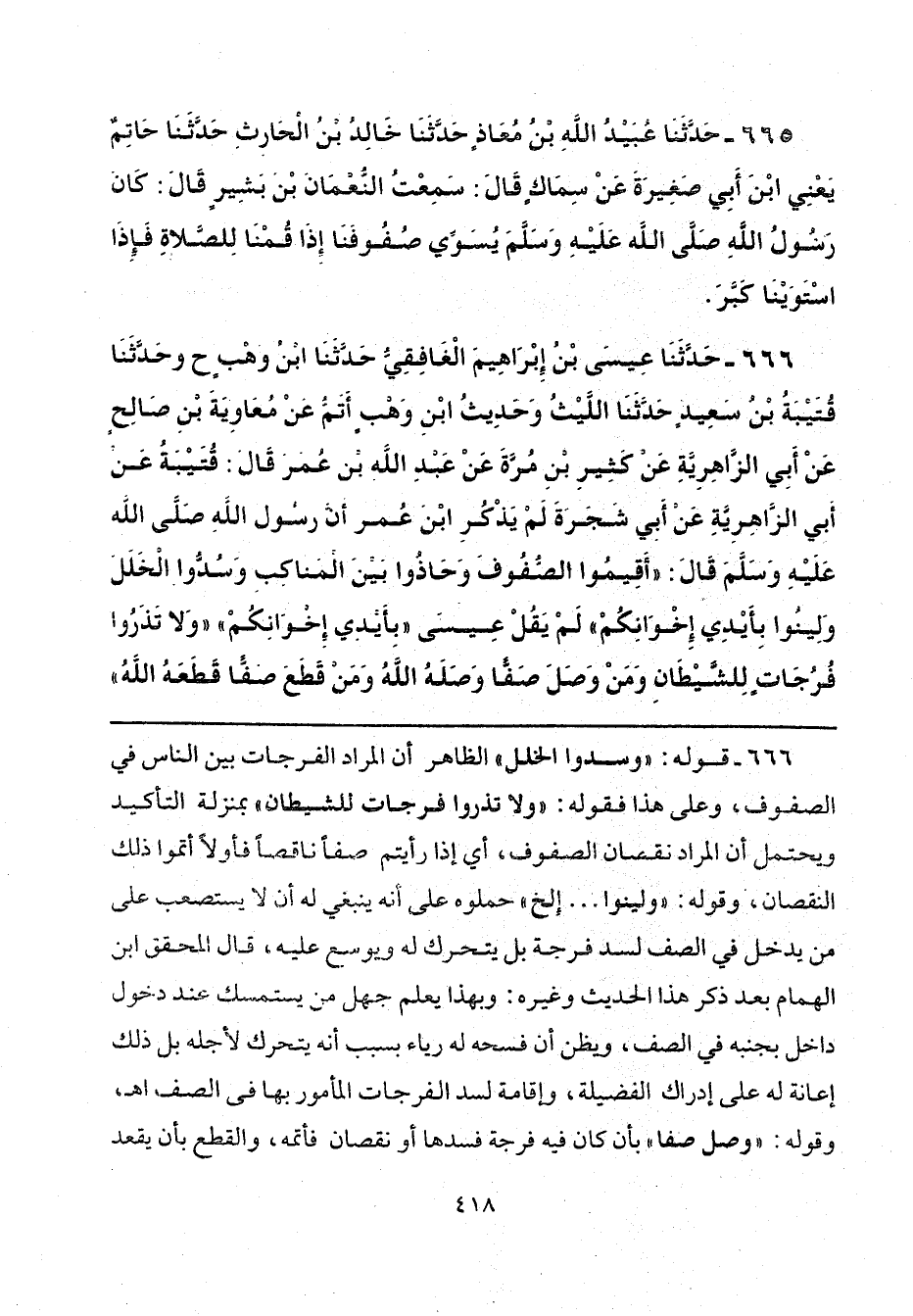 666 - حَدَّثَنَا عِيسَى بْنُ إِبْرَاهِيمَ الْغَافِقِيُّ، حَدَّثَنَا ابْنُ وَهْبٍ، ح وَحَدَّثَنَا قُتَيْبَةُ بْنُ سَعِيدٍ، حَدَّثَنَا اللَّيْثُ، وَحَدِيثُ ابْنِ وَهْبٍ أَتَمُّ عَنْ مُعَاوِيَةَ بْنِ صَالِحٍ، عَنْ أَبِي الزَّاهِرِيَّةِ، عَنْ كَثِيرِ بْنِ مُرَّةَ، عَنْ عَبْدِ اللَّهِ بْنِ عُمَرَ، قَالَ قُتَيْبَةُ: عَنْ أَبِي الزَّاهِرِيَّةِ، عَنْ أَبِي شَجَرَةَ - لَمْ يَذْكُرِ ابْنَ عُمَرَ - أَنَّ رَسُولَ اللَّهِ صَلَّى اللهُ عَلَيْهِ وَسَلَّمَ، قَالَ: «أَقِيمُوا الصُّفُوفَ وَحَاذُوا بَيْنَ الْمَنَاكِبِ وَسُدُّوا الْخَلَلَ وَلِينُوا بِأَيْدِي إِخْوَانِكُمْ - لَمْ يَقُلْ عِيسَى بِأَيْدِي إِخْوَانِكُمْ - وَلَا تَذَرُوا فُرُجَاتٍ لِلشَّيْطَانِ وَمَنْ وَصَلَ صَفًّا وَصَلَهُ اللَّهُ، وَمَنْ قَطَعَ صَفًّا قَطَعَهُ اللَّهُ»،