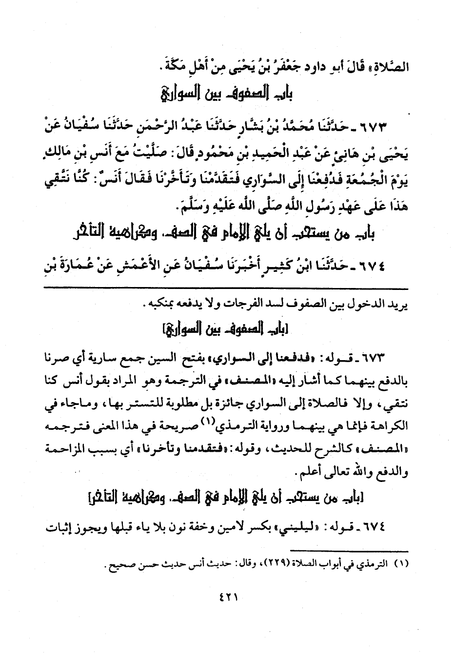 673 - قوله: "فدفعا إلى السواري" بفتح السين جمع سارية أي صرنا بالدفع بينهما كما أشار إليه "المصنف" في الترجمة وهو المراد يقول أنس كنا نتقي، وإلا فالصلاة إلى السواري جائزة بل مطلوبة للتستر بها، وماجاء في الكراهة فإنما هي بينهما ورواية الترمذي (¬1) صريحة في هذا المعنى فترجمه "المصنف" كالشرح للحديث، وقوله: "فتقدمنا وتأخرنا" أي بسبب المزاحمة والدفع والله تعالى أعلم.