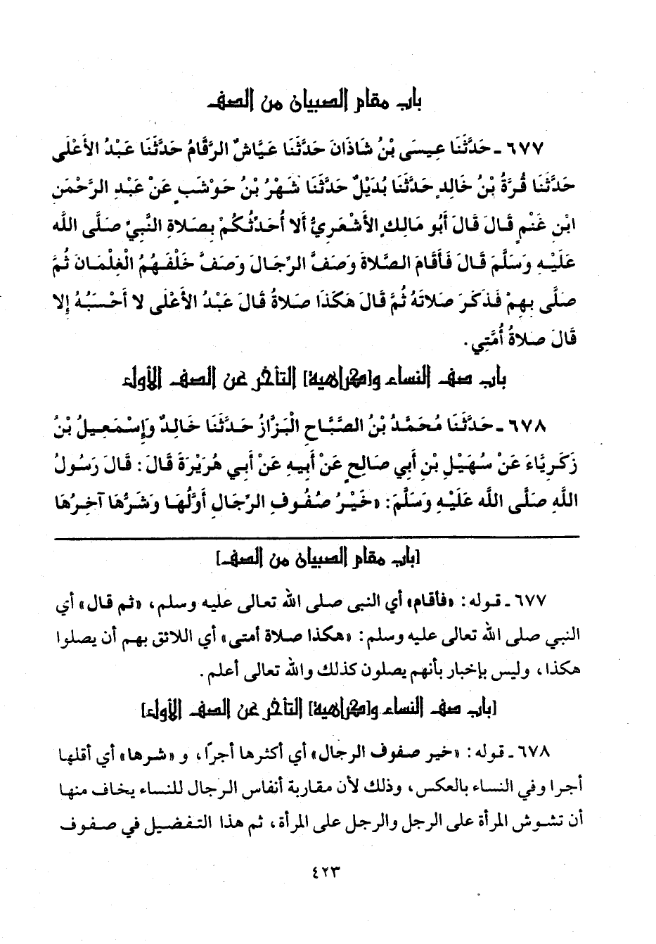 678 - قوله: "خير صفوف الرجال" أي أكثرها أجرًا، و "شرها" أي أقلها أجرا وفي النساء بالعكس، وذلك لأن مقاربة أنفاس الرجال للنساء يخاف منها أن تشوش المرأة على الرجل والرجل على المرأة، ثم هذا التفضيل في صفوف