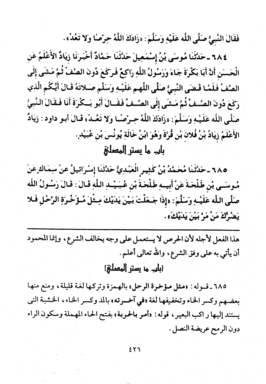 685 - حَدَّثَنَا مُحَمَّدُ بْنُ كَثِيرٍ الْعَبْدِيُّ، حَدَّثَنَا إِسْرَائِيلُ، عَنْ سِمَاكٍ، عَنْ مُوسَى بْنِ طَلْحَةَ، عَنْ أَبِيهِ طَلْحَةَ بْنِ عُبَيْدِ اللَّهِ، قَالَ: قَالَ رَسُولُ اللَّهِ صَلَّى اللهُ عَلَيْهِ وَسَلَّمَ: «إِذَا جَعَلْتَ بَيْنَ يَدَيْكَ مِثْلَ مُؤَخِّرَةِ الرَّحْلِ فَلَا يَضُرُّكَ مَنْ مَرَّ بَيْنَ يَدَيْكَ».