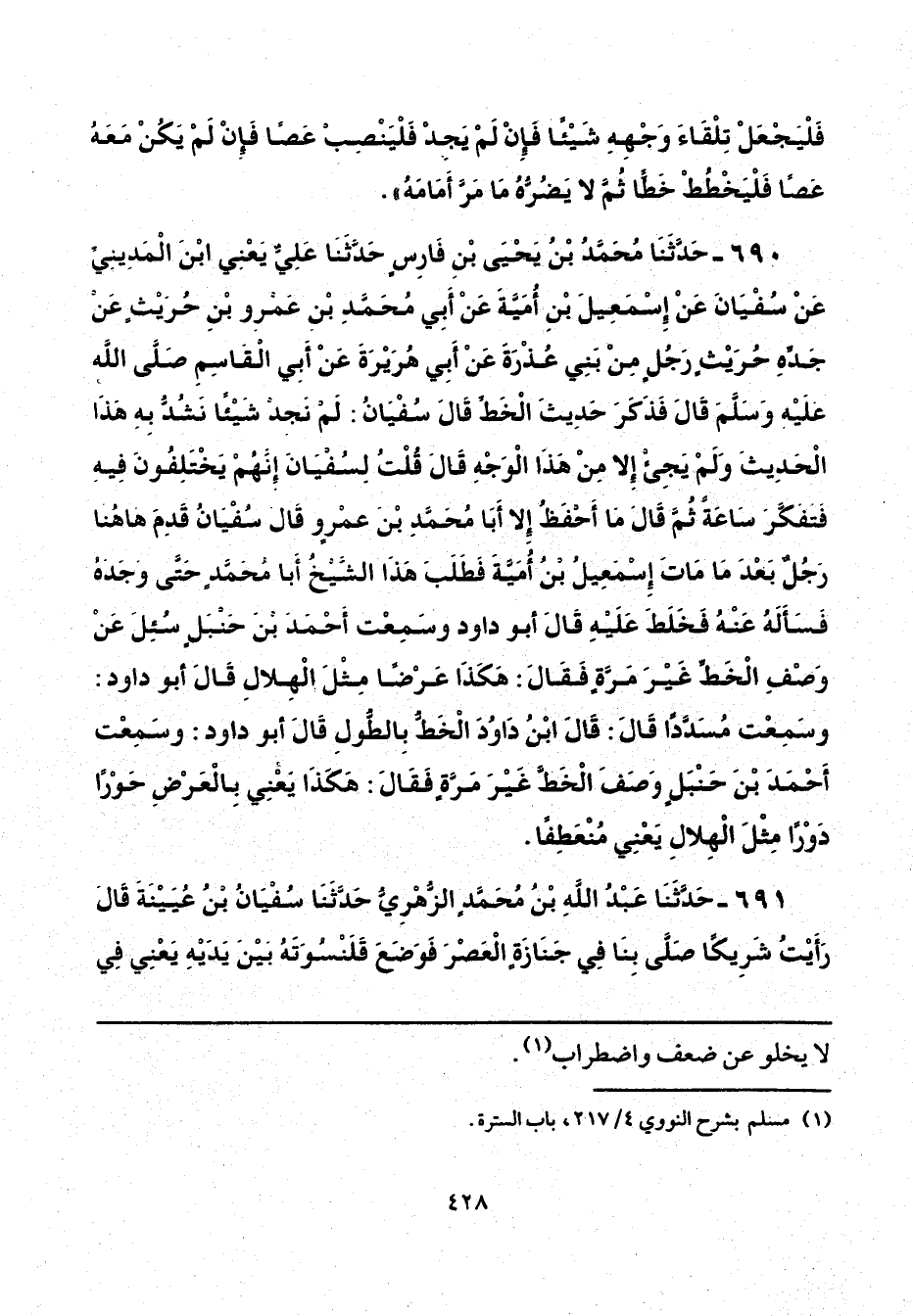 690 - حَدَّثَنَا مُحَمَّدُ بْنُ يَحْيَى بْنِ فَارِسٍ، حَدَّثَنَا عَلِيٌّ يَعْنِي ابْنَ الْمَدِينِيِّ، عَنْ سُفْيَانَ، عَنْ إِسْمَاعِيلَ بْنِ أُمَيَّةَ، عَنْ أَبِي مُحَمَّدِ بْنِ عَمْرِو بْنِ حُرَيْثٍ، عَنْ جَدِّهِ حُرَيْثٍ، رَجُلٍ مِنْ بَنِي عُذْرَةَ، عَنْ أَبِي هُرَيْرَةَ، عَنْ أَبِي الْقَاسِمِ صَلَّى اللهُ عَلَيْهِ وَسَلَّمَ، قَالَ: فَذَكَرَ حَدِيثَ الْخَطِّ، قَالَ سُفْيَانُ: لَمْ نَجِدْ شَيْئًا نَشُدُّ بِهِ هَذَا الْحَدِيثَ، وَلَمْ يَجِئْ إِلَّا مِنْ هَذَا الْوَجْهِ، قَالَ: قُلْتُ لِسُفْيَانَ: إِنَّهُمْ يَخْتَلِفُونَ فِيهِ فَتَفَكَّرَ سَاعَةً، ثُمَّ قَالَ: مَا أَحْفَظُ إِلَّا أَبَا مُحَمَّدِ بْنَ عَمْرٍو، قَالَ سُفْيَانُ: قَدِمَ هَاهُنَا رَجُلٌ بَعْدَ مَا مَاتَ إِسْمَاعِيلُ بْنُ أُمَيَّةَ فَطَلَبَ هَذَا الشَّيْخُ أَبَا مُحَمَّدٍ حَتَّى وَجَدَهُ فَسَأَلَهُ عَنْهُ فَخَلَطَ عَلَيْهِ، قَالَ أَبُو دَاوُدَ: " وسَمِعْت أَحْمَدَ بْنَ حَنْبَلٍ سُئِلَ عَنْ وَصْفِ الْخَطِّ غَيْرَ مَرَّةٍ، فَقَالَ: هَكَذَا عَرْضًا مِثْلَ الْهِلَالِ "، قَالَ أَبُو دَاوُدَ: "وسَمِعْت مُسَدَّدًا، قَالَ: قَالَ ابْنُ دَاوُدَ: الْخَطُّبِ الطُّولِ "، قَالَ أَبُو دَاوُدَ: " وسَمِعْت أَحْمَدَ بْنَ حَنْبَل وَصَفَ الْخَطَّ غَيْرَ مَرَّةٍ فَقَالَ: هَكَذَا يَعْنِي بِالْعَرْضِ حَوْرًا دَوْرًا مِثْلَ الْهِلَالِ يَعْنِي مُنْعَطِفًا".