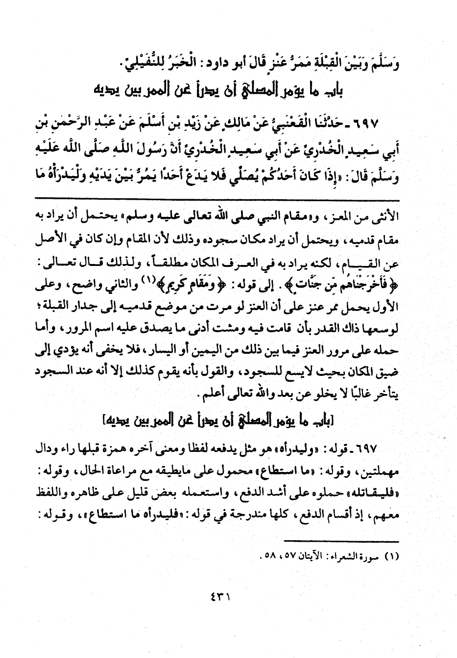 الأنثى من المعز، و"مقام النبي صلى الله تعالى عليه وسلم" يحتمل أن يراد به مقام قدميه، ويحتمل أن يراد مكان سجوده وذلك لأن المقام وإن كان في الأصل عن القيام، لكنه يراد به في العرف المكان مطلقًا، ولذلك قال تعالى: {فَأَخْرَجْنَاهُمْ مِنْ جَنَّاتٍ}. إلى قوله: {وَمَقَامٍ كَرِيمٍ} (¬1) والثاني واضح، وعلى الأول يحمل ممر عنز على أن العنز لو مرت من موضع قدميه إلى جدار القبلة؛ لوسعها ذاك القدر بأن قامت فيه ومشت أدنى ما يصدق عليه اسم المرور، وأما حمله على مرور العنز فيما بين ذلك من اليمين أو اليسار، فلا يخفى أنه يؤدي إلى ضيق المكان بحيث لا يسع للسجود، والقول بأنه يقوم كذلك إلا أنه عند السجود يتأخر غالبًا لا يخلو عن بعد والله تعالى أعلم.