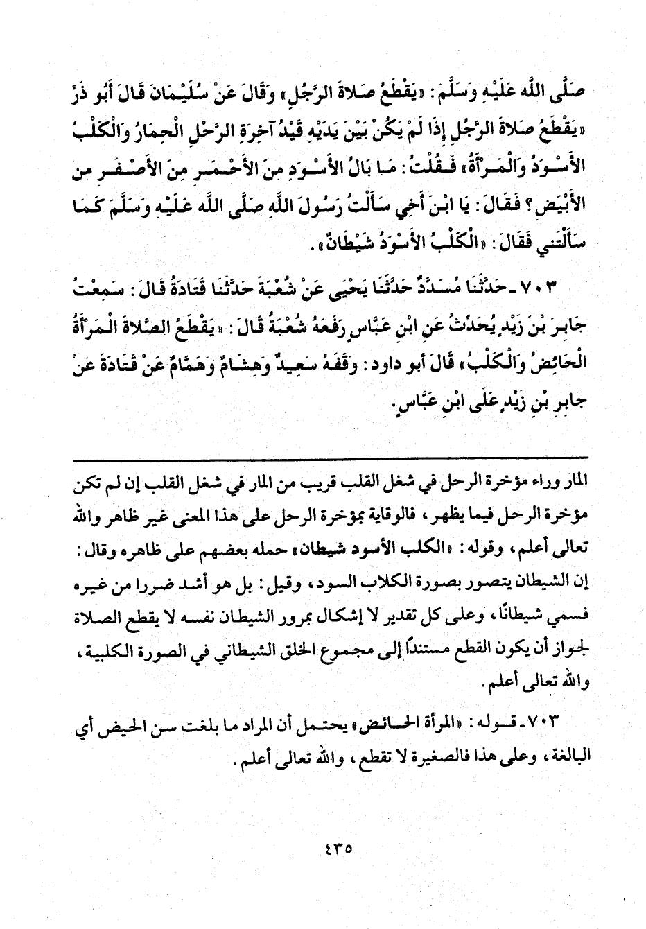 703 - حَدَّثَنَا مُسَدَّدٌ، حَدَّثَنَا يَحْيَى، عَنْ شُعْبَةَ، حَدَّثَنَا قَتَادَةُ، قَالَ: سَمِعْتُ جَابِرَ بْنَ زَيْدٍ، يُحَدِّثُ عَنِ ابْنِ عَبَّاسٍ - رَفَعَهُ شُعْبَةُ - قَالَ: «يَقْطَعُ الصَّلَاةَ الْمَرْأَةُ الْحَائِضُ وَالْكَلْبُ»، قَالَ أَبُو دَاوُدَ: وَقَفَهُ سَعِيدٌ، وَهِشَامٌ، وَهَمَّامٌ، عَنْ قَتَادَةَ، عَنْ جَابِرِ بْنِ زَيْدٍ، عَلَى ابْنِ عَبَّاسٍ.