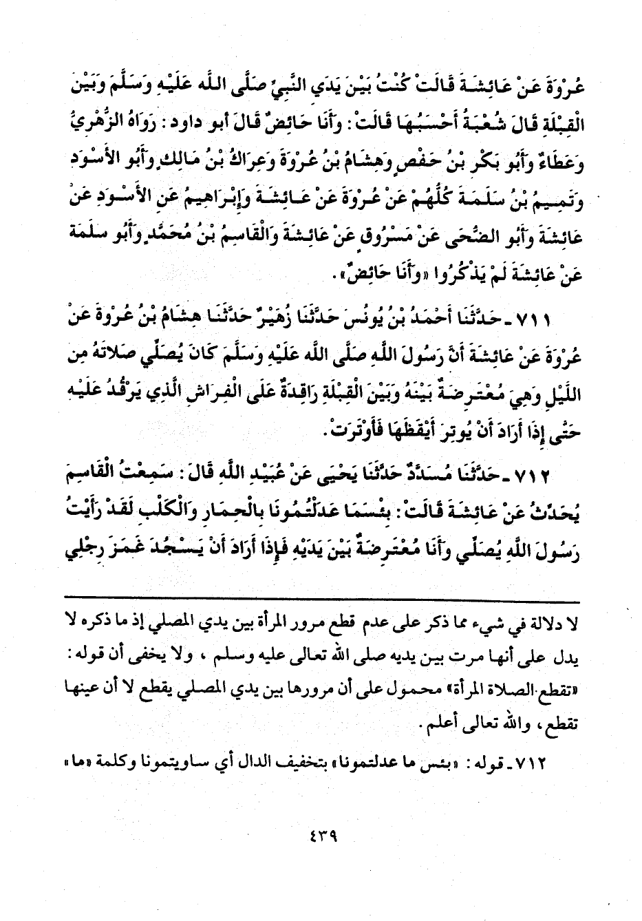 712 - حَدَّثَنَا مُسَدَّدٌ، حَدَّثَنَا يَحْيَى، عَنْ عُبَيْدِ اللَّهِ، قَالَ: سَمِعْتُ الْقَاسِمَ، يُحَدِّثُ عَنْ عَائِشَةَ، قَالَتْ: بِئْسَمَا عَدَلْتُمُونَا بِالْحِمَارِ وَالْكَلْبِ لَقَدْ رَأَيْتُ رَسُولَ اللَّهِ «يُصَلِّي وَأَنَا مُعْتَرِضَةٌ بَيْنَ يَدَيْهِ فَإِذَا أَرَادَ أَنْ يَسْجُدَ غَمَزَ رِجْلِي