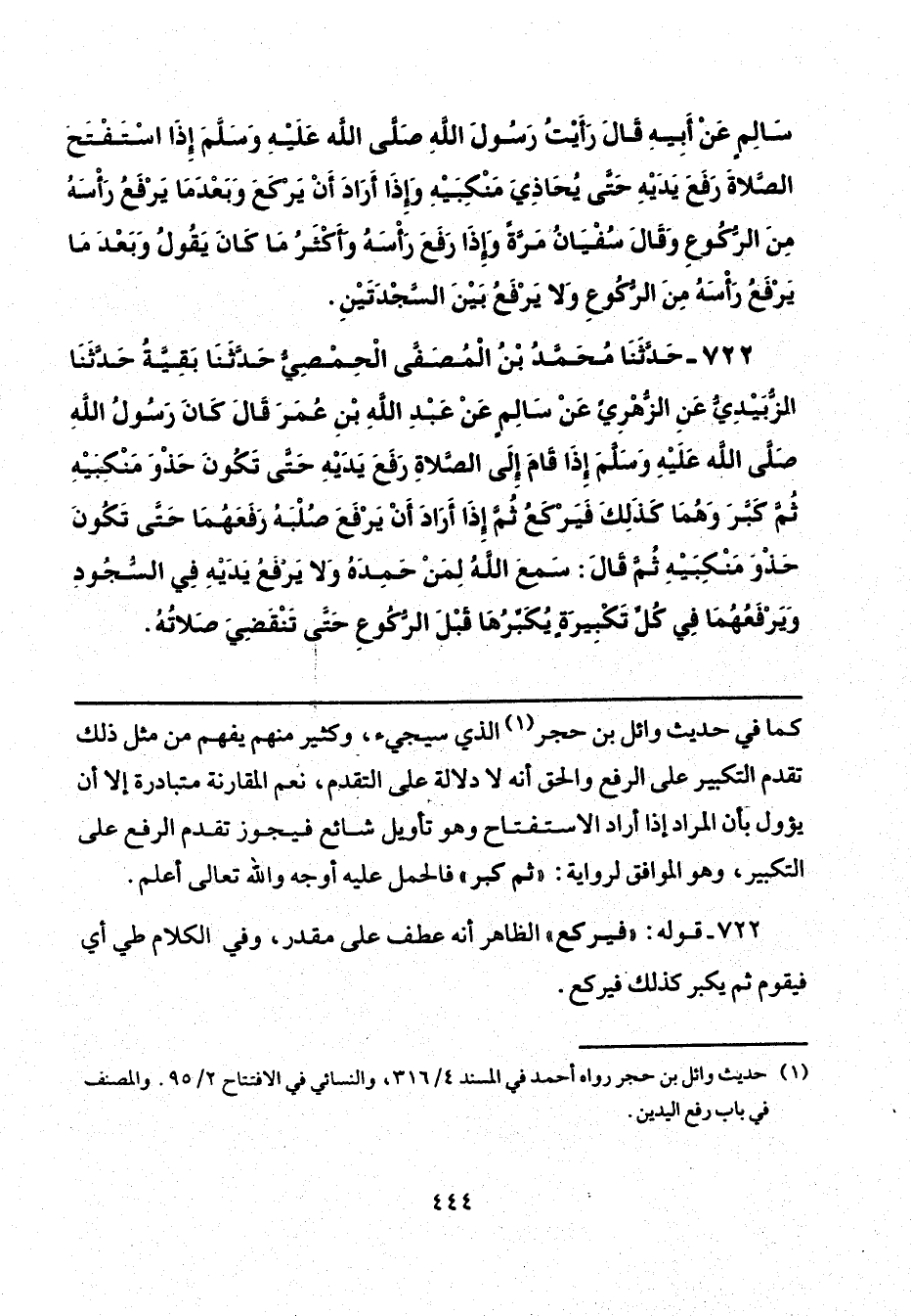 722 - حَدَّثَنَا مُحَمَّدُ بْنُ الْمُصَفَّى الْحِمْصِيُّ، حَدَّثَنَا بَقِيَّةُ، حَدَّثَنَا الزُّبَيْدِيُّ، عَنِ الزُّهْرِيِّ، عَنْ سَالِمٍ، عَنْ عَبْدِ اللَّهِ بْنِ عُمَرَ، قَالَ: "كَانَ رَسُولُ اللَّهِ صَلَّى اللهُ عَلَيْهِ وَسَلَّمَ إِذَا قَامَ إِلَى الصَّلَاةِ رَفَعَ يَدَيْهِ حَتَّى تَكُونَ حَذْوَ مَنْكِبَيْهِ، ثُمَّ كَبَّرَ وَهُمَا كَذَلِكَ فَيَرْكَعُ، ثُمَّ إِذَا أَرَادَ أَنْ يَرْفَعَ صُلْبَهُ رَفَعَهُمَا حَتَّى تَكُونَ حَذْوَ مَنْكِبَيْهِ، ثُمَّ قَالَ: سَمِعَ اللَّهُ لِمَنْ حَمِدَهُ وَلَا يَرْفَعُ يَدَيْهِ فِي السُّجُودِ وَيَرْفَعُهُمَا فِي كُلِّ تَكْبِيرَةٍ يُكَبِّرُهَا قَبْلَ الرُّكُوعِ حَتَّى تَنْقَضِيَ صَلَاتُهُ".