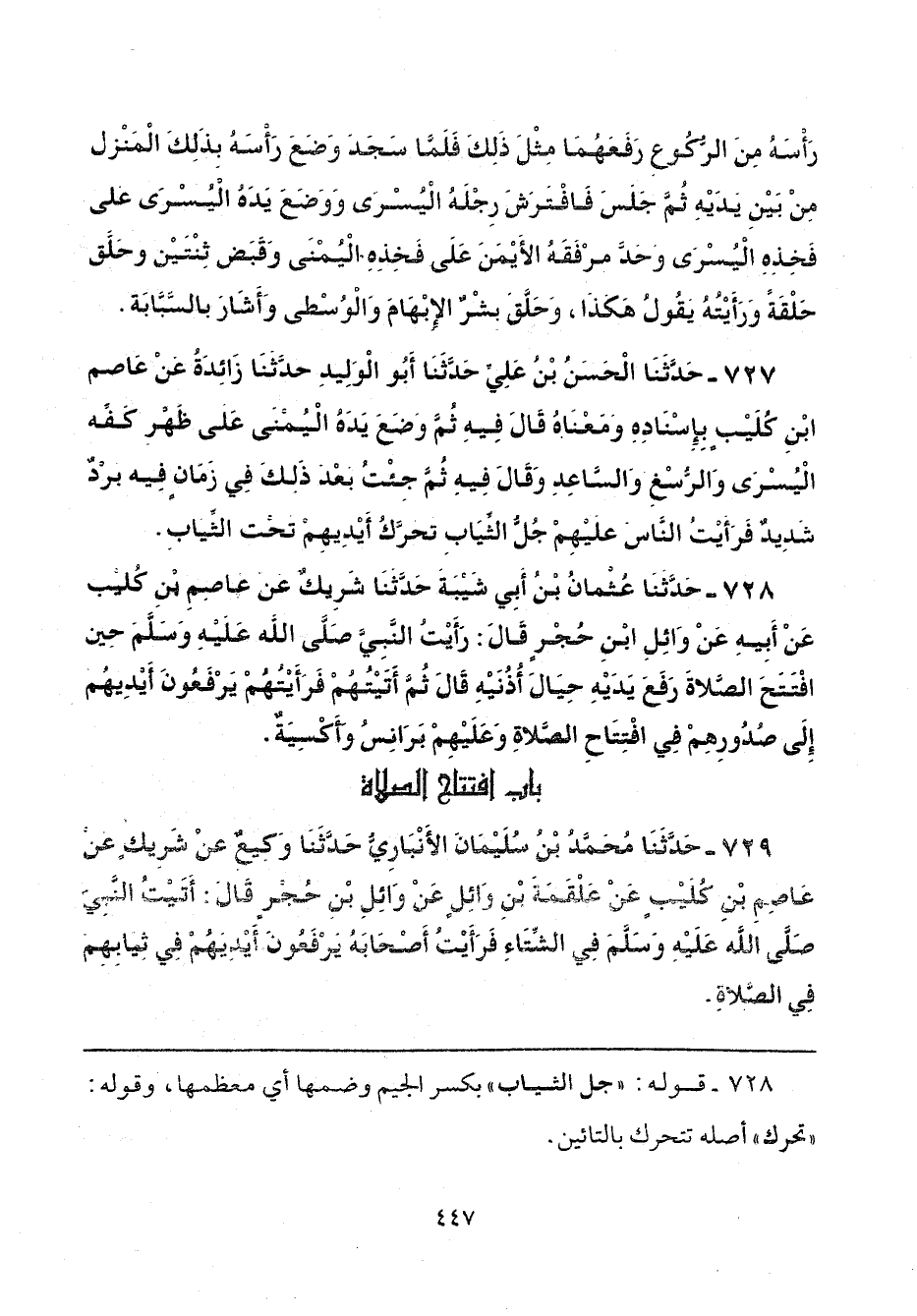 728 - حَدَّثَنَا عُثْمَانُ بْنُ أَبِي شَيْبَةَ، حَدَّثَنَا شَرِيكٌ، عَنْ عَاصِمِ بْنِ كُلَيْبٍ، عَنْ أَبِيهِ، عَنْ وَائِلِ بْنِ حُجْرٍ، قَالَ: رَأَيْتُ النَّبِيَّ صَلَّى اللهُ عَلَيْهِ وَسَلَّمَ «حِينَ افْتَتَحَ الصَّلَاةَ رَفَعَ يَدَيْهِ حِيَالَ أُذُنَيْهِ»، قَالَ: ثُمَّ أَتَيْتُهُمْ فَرَأَيْتُهُمْ يَرْفَعُونَ أَيْدِيَهُمْ إِلَى صُدُورِهِمْ فِي افْتِتَاحِ الصَّلَاةِ وَعَلَيْهِمْ بَرَانِسُ وَأَكْسِيَةٌ.