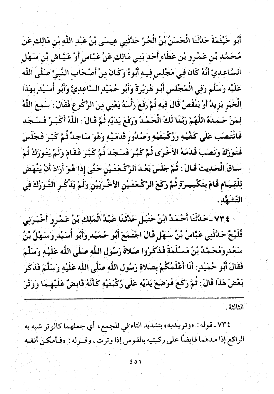 734 - حَدَّثَنَا أَحْمَدُ بْنُ حَنْبَلٍ، حَدَّثَنَا عَبْدُ الْمَلِكِ بْنُ عَمْرٍو، أَخْبَرَنِي فُلَيْحٌ، حَدَّثَنِي عَبَّاسُ بْنُ سَهْلٍ، قَالَ: اجْتَمَعَ أَبُو حُمَيْدٍ، وَأَبُو أُسَيْدٍ، وَسَهْلُ بْنُ سَعْدٍ، وَمُحَمَّدُ بْنُ مَسْلَمَةَ، فَذَكَرُوا صَلَاةَ رَسُولِ اللَّهِ صَلَّى اللهُ عَلَيْهِ وَسَلَّمَ فَقَالَ أَبُو حُمَيْدٍ: أَنَا أَعْلَمُكُمْ بِصَلَاةِ رَسُولِ اللَّهِ صَلَّى اللهُ عَلَيْهِ وَسَلَّمَ فَذَكَرَ بَعْضَ هَذَا، قَالَ: "ثُمَّ رَكَعَ فَوَضَعَ يَدَيْهِ عَلَى رُكْبَتَيْهِ كَأَنَّهُ قَابِضٌ عَلَيْهِمَا، وَوَتَّرَ