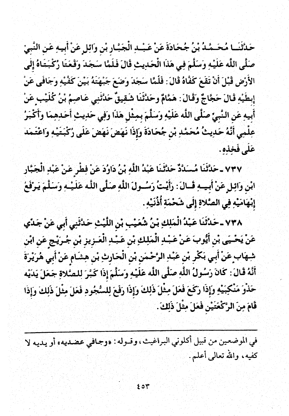 737 - حَدَّثَنَا مُسَدَّدٌ، حَدَّثَنَا عَبْدُ اللَّهِ بْنُ دَاوُدَ، عَنْ فِطْرٍ، عَنْ عَبْدِ الْجَبَّارِ بْنِ وَائِلٍ، عَنْ أَبِيهِ، قَالَ: رَأَيْتُ رَسُولَ اللَّهِ صَلَّى اللهُ عَلَيْهِ وَسَلَّمَ «يَرْفَعُ إِبْهَامَيْهِ فِي الصَّلَاةِ إِلَى شَحْمَةِ أُذُنَيْهِ».