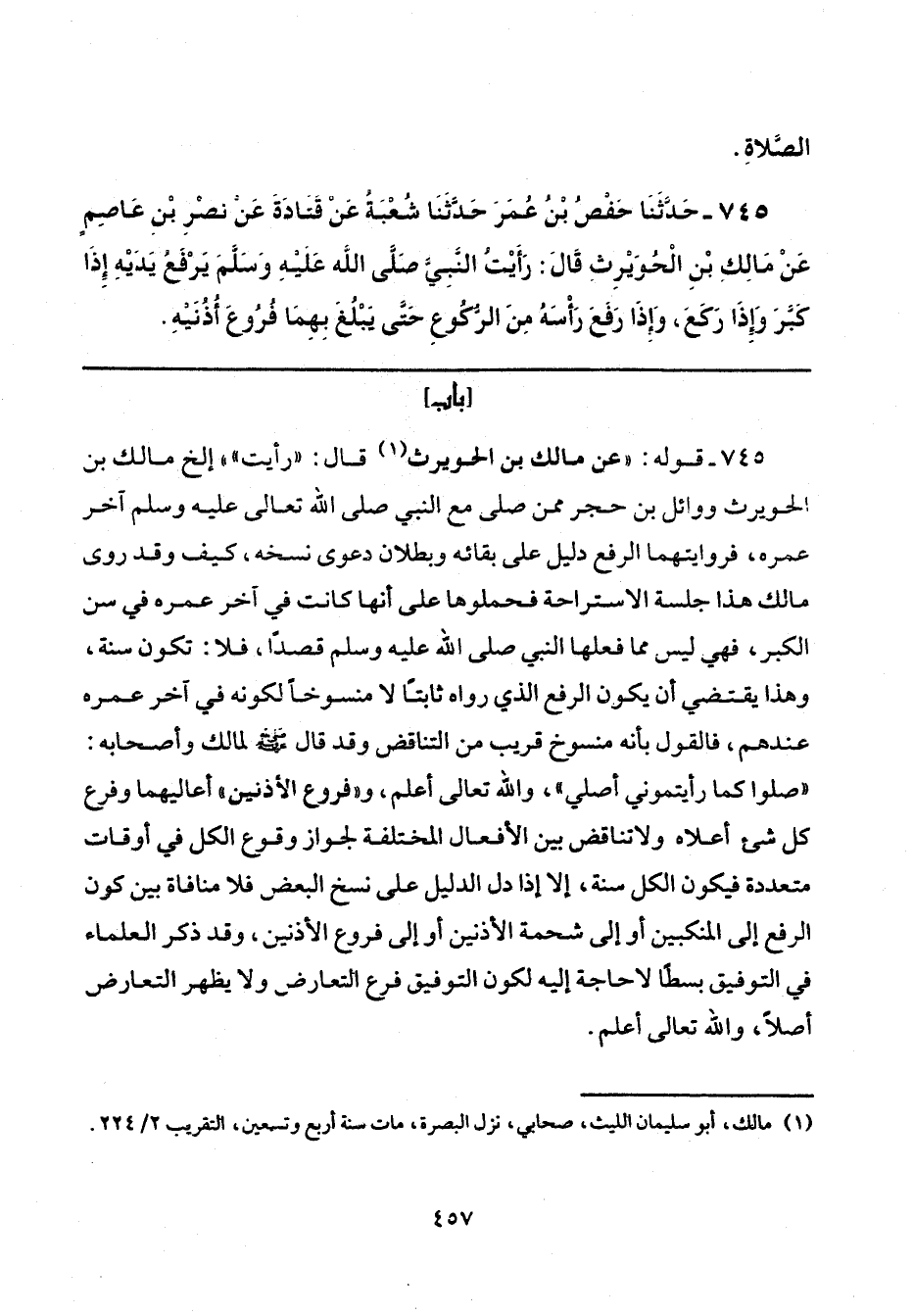 743 - قوله: "عن مالك بن الحويرث (¬1) قال: "رأيت" إلخ مالك بن الحويرث ووائل بن حجر ممن صلى مع النبي صلى الله تعالى عليه وسلم آخر عمره، فروايتهما الرفع دليل على بقائه وبطلان دعوى نسخه، كيف وقد روى مالك هذا جلسة الاستراحة فحملوها على أنها كانت في آخر عمره في سن الكبر، فهي ليس مما فعلها النبي صلى الله عليه وسلم قصدًا، فلا: تكون سنة، وهذا يقتضي أن يكون الرفع الذي رواه ثابتًا لا منسوخًا لكونه في آخر عمره عندهم، فالقول بأنه منسوخ قريب من التناقض وقد قال - صلى الله عليه وسلم - لمالك وأصحابه: "صلوا كما رأيتموني أصلي"، والله تعالى أعلم، و "فروع الأذنين" أعاليهما وفرع كل شيء أعلاه ولا تناقض بين الأفعال المختلفة لجواز وقوع الكل في أوقات متعددة فيكون الكل سنة، إلا إذا دل الدليل على نسخ البعض فلا منافاة بين كون الرفع إلى المنكبين أو إلى شحمة الأذنين أو إلى فروع الأذنين، وقد ذكر العلماء في التوفيق بسطًا لا حاجة إليه لكون التوفيق فرع التعارض ولا يظهر التعارض أصلًا، والله تعالى أعلم.