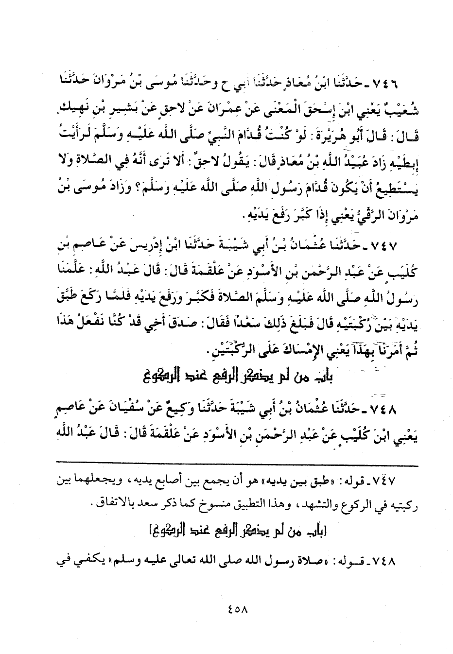 747 - حَدَّثَنَا عُثْمَانُ بْنُ أَبِي شَيْبَةَ، حَدَّثَنَا ابْنُ إِدْرِيسَ، عَنْ عَاصِمِ بْنِ كُلَيْبٍ، عَنْ عَبْدِ الرَّحْمَنِ بْنِ الْأَسْوَدِ، عَنْ عَلْقَمَةَ، قَالَ: قَالَ عَبْدُ اللَّهِ: «عَلَّمَنَا رَسُولُ اللَّهِ صَلَّى اللهُ عَلَيْهِ وَسَلَّمَ الصَّلَاةَ فَكَبَّرَ وَرَفَعَ يَدَيْهِ فَلَمَّا رَكَعَ طَبَّقَ يَدَيْهِ بَيْنَ رُكْبَتَيْهِ» قَالَ: فَبَلَغَ ذَلِكَ سَعْدًا، فَقَالَ: صَدَقَ أَخِي، قَدْ كُنَّا نَفْعَلُ هَذَا ثُمَّ أَمَرَنَا بِهَذَا يَعْنِي «الْإِمْسَاكَ عَلَى الرُّكْبَتَيْنِ».