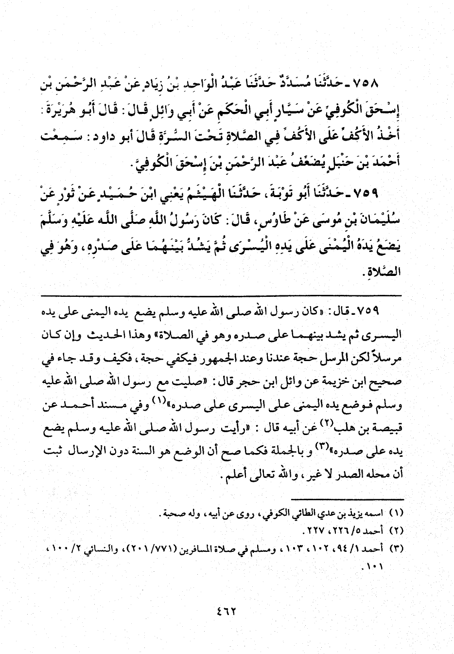 759 - قال: "كان رسول الله صلى الله عليه وسلم يضع يده اليمنى على يده اليسرى ثم يشد بينهما ما على صدره وهو في الصلاة" وهذا الحديث وإن كان مرسلًا لكن المرسل حجة عندنا وعند الجمهور فيكفي حجة، فكيف وقد جاء في صحيح ابن خزيمة عن وائل بن حجر قال: "صليت مع رسول الله صلى الله عليه وسلم فوضع يده اليمنى على اليسرى على صدره" (¬1) وفي مسند أحمد عن قبيصة بن هلب (¬2) عن أبيه قال: "رأيت رسول الله صلى الله عليه وسلم يضع يده على صدره" (¬3) وبالجملة فكما صح أن الوضع هو السنة دون الإرسال ثبت أن محله الصدر لا غير، والله تعالى أعلم.