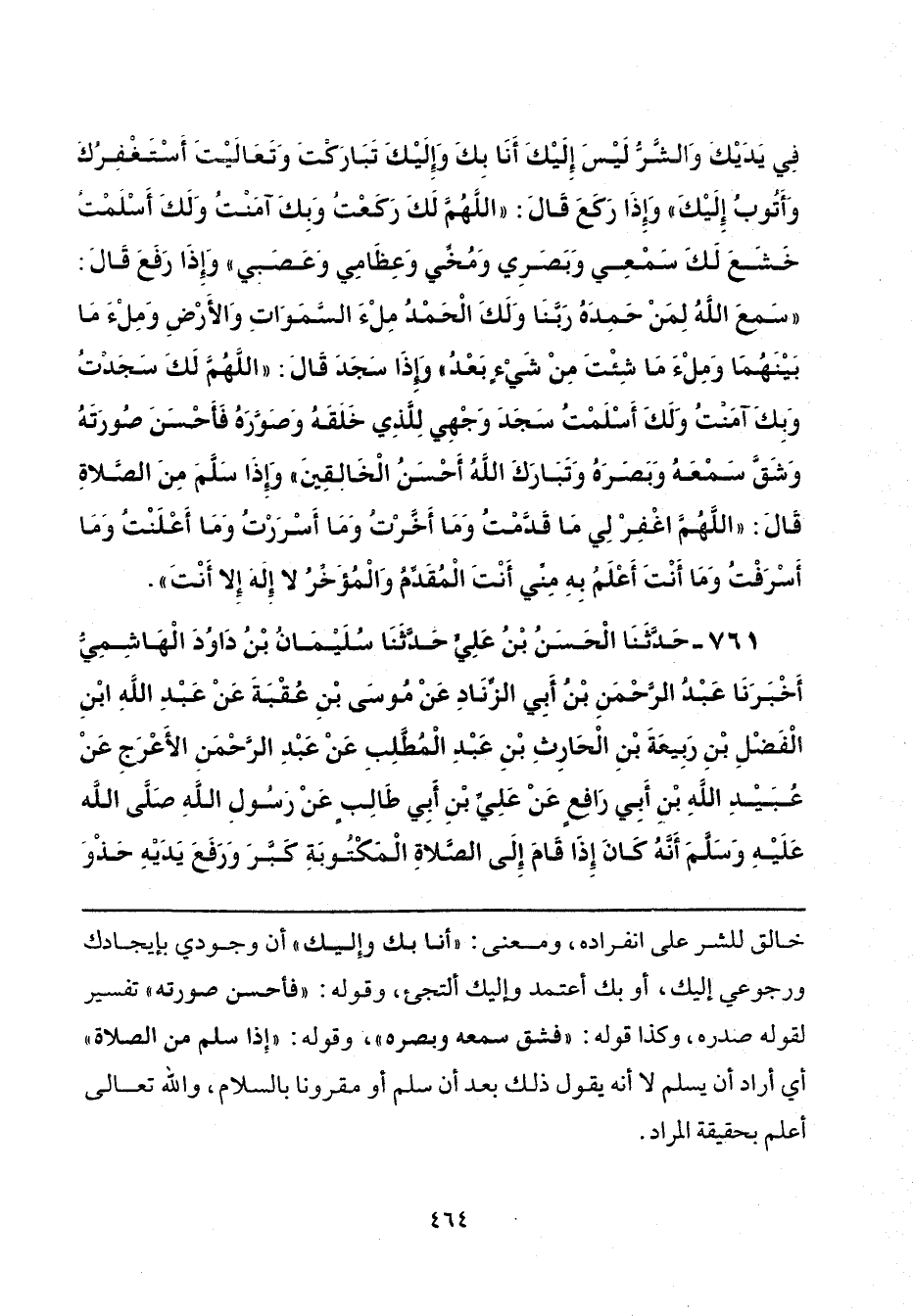 خالق للشر على انفراده، ومعنى: "أنا بك وإِليك" أن وجودي بإيجادك ورجوعي إليك، أو بك أعتمد وإليك ألتجئ وقوله: "فأحسن صورته" تفسير لقوله صدره، وكذا قوله: "فشق سمعه وبصره"، وقوله: "إِذا سلم من الصلاة" أي أراد أن يسلم لا أنه يقول ذلك بعد أن سلم أو مقرونا بالسلام، والله تعالى أعلم بحقيقة المراد.