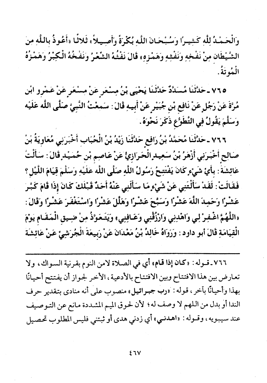 766 - حَدَّثَنَا مُحَمَّدُ بْنُ رَافِعٍ، حَدَّثَنَا زَيْدُ بْنُ الْحُبَابِ، أَخْبَرَنِي مُعَاوِيَةُ بْنُ صَالِحٍ، أَخْبَرَنِي أَزْهَرُ بْنُ سَعِيدٍ الْحَرَازِيُّ، عَنْ عَاصِمِ بْنِ حُمَيْدٍ، قَالَ: سَأَلْتُ عَائِشَةَ: بِأَيِّ شَيْءٍ كَانَ يَفْتَتِحُ رَسُولُ اللَّهِ صَلَّى اللهُ عَلَيْهِ وَسَلَّمَ قِيَامَ اللَّيْلِ فَقَالَتْ: لَقَدْ سَأَلْتَنِي عَنْ شَيْءٍ مَا سَأَلَنِي عَنْهُ أَحَدٌ قَبْلَكَ كَانَ إِذَا قَامَ كَبَّرَ عَشْرًا، وَحَمِدَ اللَّهَ عَشْرًا، وَسَبَّحَ عَشْرًا، وَهَلَّلَ عَشْرًا، وَاسْتَغْفَرَ عَشْرًا، وَقَالَ: «اللَّهُمَّ اغْفِرْ لِي وَاهْدِنِي وَارْزُقْنِي وَعَافِنِي» وَيَتَعَوَّذُ مِنْ ضِيقِ الْمَقَامِ يَوْمَ الْقِيَامَةِ، قَالَ أَبُو دَاوُدَ: وَرَوَاهُ خَالِدُ بْنُ مَعْدَانَ، عَنْ رَبِيعَةَ الْجُرَشِيِّ، عَنْ عَائِشَةَ