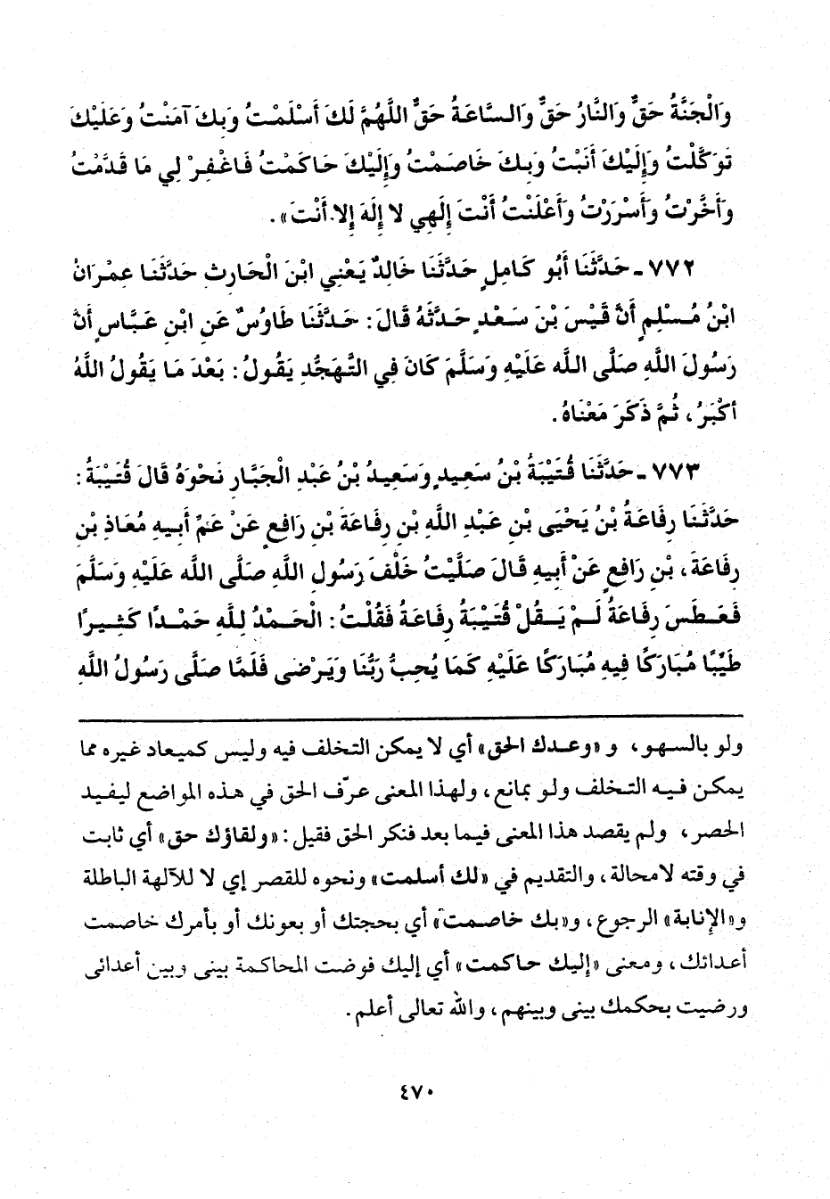 773 - حَدَّثَنَا قُتَيْبَةُ بْنُ سَعِيدٍ، وَسَعِيدُ بْنُ عَبْدِ الْجَبَّارِ - نَحْوَهُ - قَالَ قُتَيْبَةُ: حَدَّثَنَا رِفَاعَةُ بْنُ يَحْيَى بْنِ عَبْدِ اللَّهِ بْنِ رِفَاعَةَ بْنِ رَافِعٍ، عَنْ عَمِّ أَبِيهِ مُعَاذِ بْنِ رِفَاعَةَ بْنِ رَافِعٍ، عَنْ أَبِيهِ، قَالَ: صَلَّيْتُ خَلْفَ رَسُولِ اللَّهِ صَلَّى اللهُ عَلَيْهِ وَسَلَّمَ فَعَطَسَ رِفَاعَةُ - لَمْ يَقُلْ قُتَيْبَةُ: رِفَاعَةُ - فَقُلْتُ: الْحَمْدُ لِلَّهِ حَمْدًا كَثِيرًا طَيِّبًا مُبَارَكًا فِيهِ مُبَارَكًا عَلَيْهِ، كَمَا يُحِبُّ رَبُّنَا وَيَرْضَى، فَلَمَّا صَلَّى رَسُولُ اللَّهِ