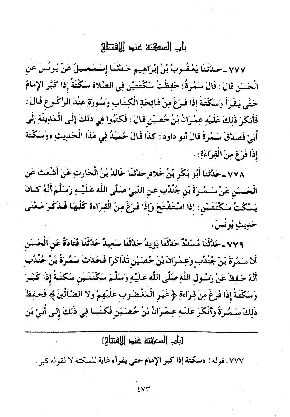 777 - حَدَّثَنَا يَعْقُوبُ بْنُ إِبْرَاهِيمَ، حَدَّثَنَا إِسْمَاعِيلُ، عَنْ يُونُسَ، عَنِ الْحَسَنِ، قَالَ: قَالَ سَمُرَةُ «حَفِظْتُ سَكْتَتَيْنِ فِي الصَّلَاةِ، سَكْتَةً إِذَا كَبَّرَ الْإِمَامُ حَتَّى يَقْرَأَ، وَسَكْتَةً إِذَا فَرَغَ مِنْ فَاتِحَةِ الْكِتَابِ، وَسُورَةٍ عِنْدَ الرُّكُوعِ»، قَالَ: فَأَنْكَرَ ذَلِكَ عَلَيْهِ عِمْرَانُ بْنُ حُصَيْنٍ، قَالَ: فَكَتَبُوا فِي ذَلِكَ إِلَى الْمَدِينَةِ إِلَى أُبَيٍّ فَصَدَّقَ سَمُرَةَ، قَالَ أَبُو دَاوُدَ: كَذَا قَالَ حُمَيْدٌ، فِي هَذَا الْحَدِيثِ «وَسَكْتَةً إِذَا فَرَغَ مِنَ الْقِرَاءَةِ».