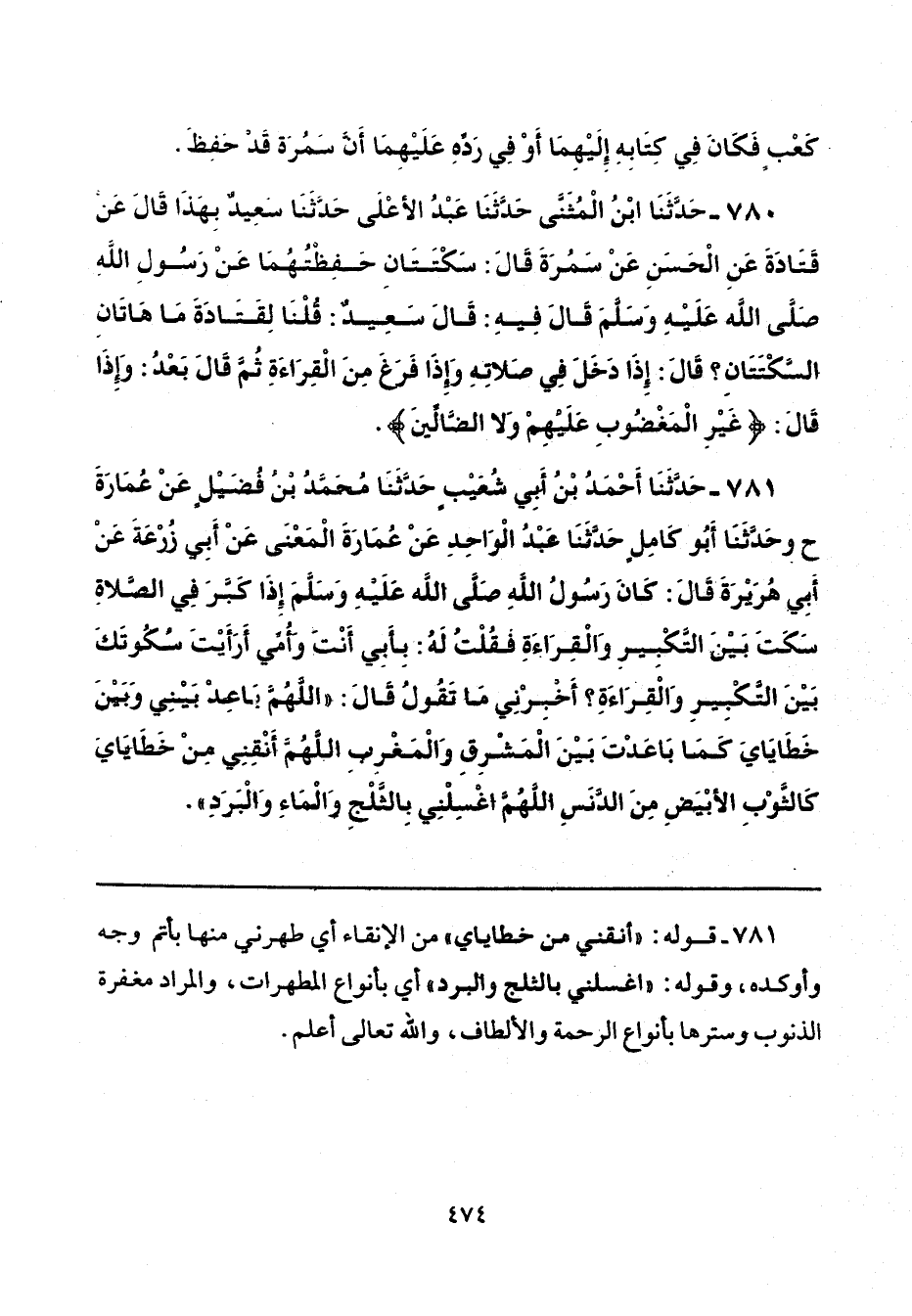 781 - حَدَّثَنَا أَحْمَدُ بْنُ أَبِي شُعَيْبٍ، حَدَّثَنَا مُحَمَّدُ بْنُ فُضَيْلٍ، عَنْ عُمَارَةَ، ح وَحَدَّثَنَا أَبُو كَامِلٍ، حَدَّثَنَا عَبْدُ الْوَاحِدِ، عَنْ عُمَارَةَ الْمَعْنَى، عَنْ أَبِي زُرْعَةَ، عَنْ أَبِي هُرَيْرَةَ، قَالَ: كَانَ رَسُولُ اللَّهِ صَلَّى اللهُ عَلَيْهِ وَسَلَّمَ «إِذَا كَبَّرَ فِي الصَّلَاةِ سَكَتَ بَيْنَ التَّكْبِيرِ وَالْقِرَاءَةِ»، فَقُلْتُ لَهُ: بِأَبِي أَنْتَ وَأُمِّي، أَرَأَيْتَ سُكُوتَكَ بَيْنَ التَّكْبِيرِ وَالْقِرَاءَةِ أَخْبِرْنِي مَا تَقُولُ؟ قَالَ: «اللَّهُمَّ بَاعِدْ بَيْنِي وَبَيْنَ خَطَايَايَ كَمَا بَاعَدْتَ بَيْنَ الْمَشْرِقِ وَالْمَغْرِبِ، اللَّهُمَّ أَنْقِنِي مِنْ خَطَايَايَ كَالثَّوْبِ الْأَبْيَضِ مِنَ الدَّنَسِ، اللَّهُمَّ اغْسِلْنِي بِالثَّلْجِ وَالْمَاءِ وَالْبَرَدِ».