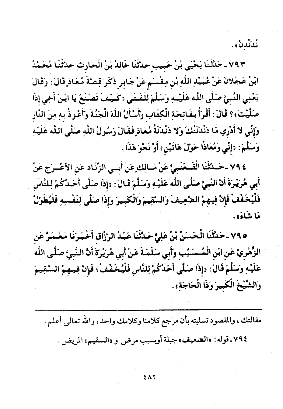 794 - حَدَّثَنَا الْقَعْنَبِيُّ، عَنْ مَالِكٍ، عَنْ أَبِي الزِّنَادِ، عَنِ الْأَعْرَجِ، عَنْ أَبِي هُرَيْرَةَ، أَنَّ النَّبِيَّ صَلَّى اللهُ عَلَيْهِ وَسَلَّمَ قَالَ: «إِذَا صَلَّى أَحَدُكُمْ لِلنَّاسِ فَلْيُخَفِّفْ فَإِنَّ فِيهِمُ الضَّعِيفَ وَالسَّقِيمَ وَالْكَبِيرَ، وَإِذَا صَلَّى لِنَفْسِهِ فَلْيُطَوِّلْ مَا شَاءَ».