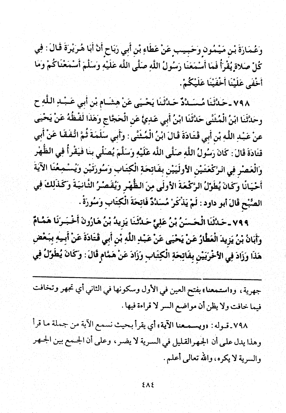 799 - حَدَّثَنَا الْحَسَنُ بْنُ عَلِيٍّ، حَدَّثَنَا يَزِيدُ بْنُ هَارُونَ، أَخْبَرَنَا هَمَّامٌ، وَأَبَانُ بْنُ يَزِيدَ الْعَطَّارُ، عَنْ يَحْيَى، عَنْ عَبْدِ اللَّهِ بْنِ أَبِي قَتَادَةَ، عَنْ أَبِيهِ، بِبَعْضِ هَذَا وَزَادَ فِي الْأُخْرَيَيْنِ بِفَاتِحَةِ الْكِتَابِ، وَزَادَ عَنْ هَمَّامٍ، قَالَ: وَكَانَ يُطَوِّلُ فِي