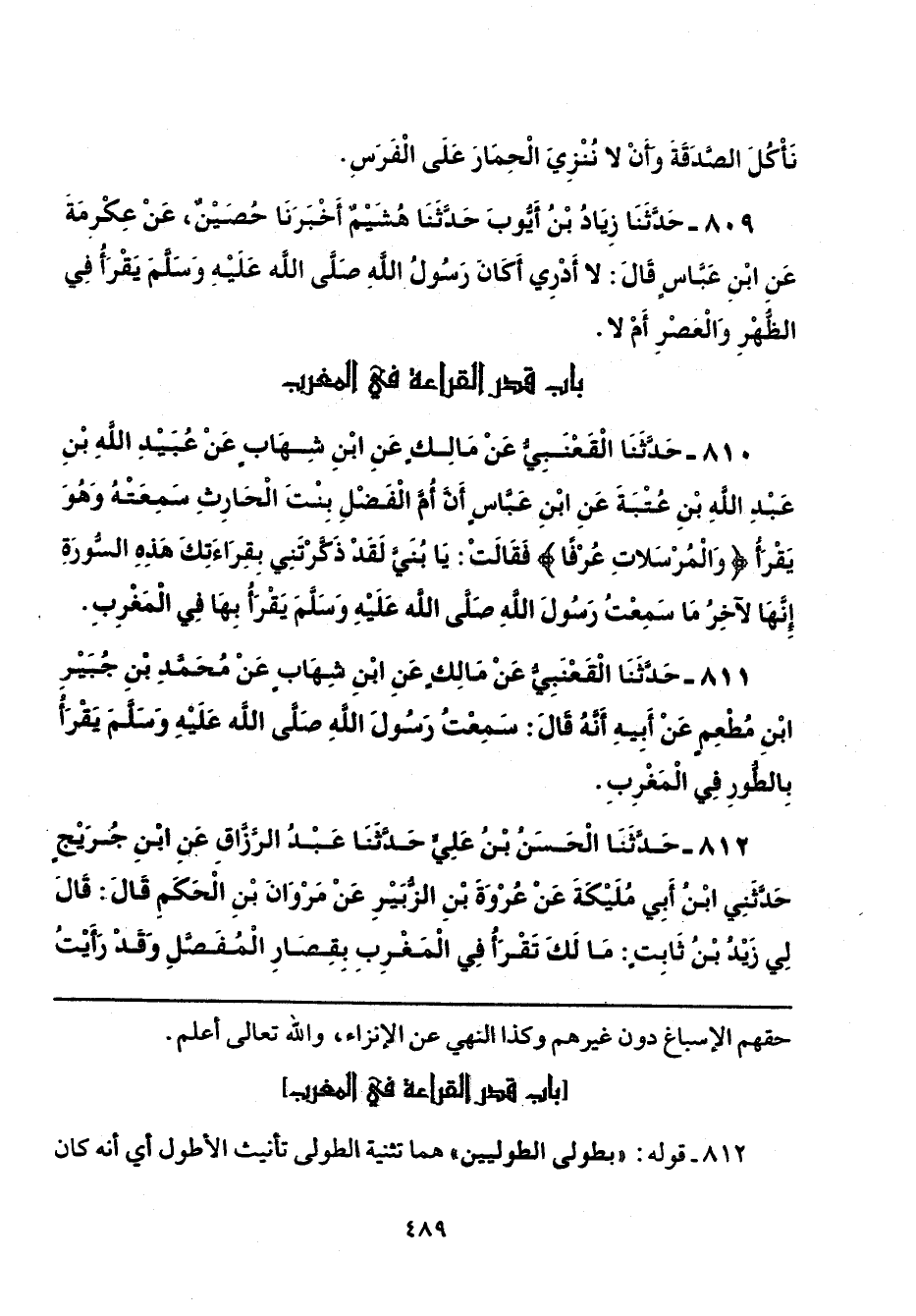 811 - حَدَّثَنَا الْقَعْنَبِيُّ، عَنْ مَالِكٍ، عَنِ ابْنِ شِهَابٍ، عَنْ مُحَمَّدِ بْنِ جُبَيْرِ بْنِ مُطْعِمٍ، عَنْ أَبِيهِ، أَنَّهُ قَالَ: سَمِعْتُ رَسُولَ اللَّهِ صَلَّى اللهُ عَلَيْهِ وَسَلَّمَ «يَقْرَأُ بِ الطُّورِ فِي الْمَغْرِبِ».