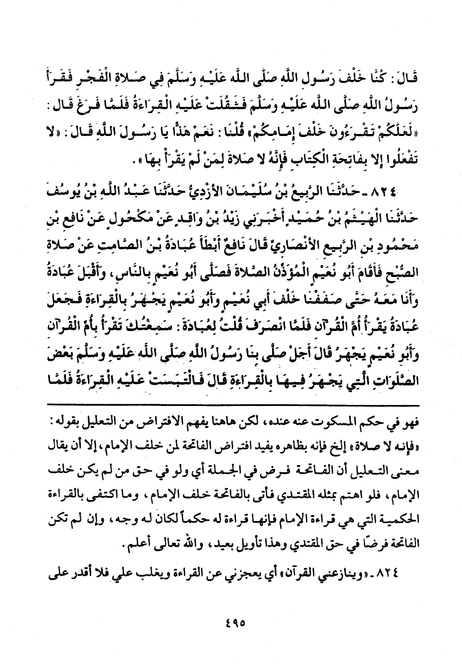 824 - حَدَّثَنَا الرَّبِيعُ بْنُ سُلَيْمَانَ الْأَزْدِيُّ، حَدَّثَنَا عَبْدُ اللَّهِ بْنُ يُوسُفَ، حَدَّثَنَا الْهَيْثَمُ بْنُ حُمَيْدٍ، أَخْبَرَنِي زَيْدُ بْنُ وَاقِدٍ، عَنْ مَكْحُولٍ، عَنْ نَافِعِ بْنِ مَحْمُودِ بْنِ الرَّبِيعِ الْأَنْصَارِيِّ قَالَ نَافِعٌ: أَبْطَأَ عُبَادَةُ بْنُ الصَّامِتِ عَنْ صَلَاةِ الصُّبْحِ، فَأَقَامَ أَبُو نُعَيْمٍ الْمُؤَذِّنُ الصَّلَاةَ فَصَلَّى أَبُو نُعَيْمٍ بِالنَّاسِ، وَأَقْبَلَ عُبَادَةُ وَأَنَا مَعَهُ، حَتَّى صَفَفْنَا خَلْفَ أَبِي نُعَيْمٍ، وَأَبُو نُعَيْمٍ يَجْهَرُ بِالْقِرَاءَةِ فَجَعَلَ عُبَادَةُ يَقْرَأُ أُمَّ الْقُرْآنِ فَلَمَّا انْصَرَفَ، قُلْتُ لِعُبَادَةَ: سَمِعْتُكَ تَقْرَأُ بِأُمِّ الْقُرْآنِ وَأَبُو نُعَيْمٍ يَجْهَرُ، قَالَ: أَجَلْ صَلَّى بِنَا رَسُولُ اللَّهِ صَلَّى اللهُ عَلَيْهِ وَسَلَّمَ بَعْضَ الصَّلَوَاتِ الَّتِي يَجْهَرُ فِيهَا بِالْقِرَاءَةِ قَالَ: فَالْتَبَسَتْ عَلَيْهِ الْقِرَاءَةُ فَلَمَّا