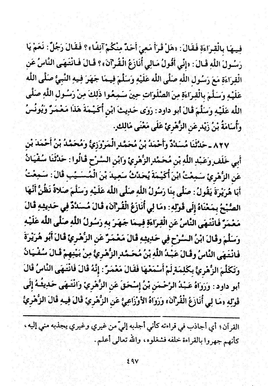 827 - حَدَّثَنَا مُسَدَّدٌ، وَأَحْمَدُ بْنُ مُحَمَّدٍ الْمَرْوَزِيُّ، وَمُحَمَّدُ بْنُ أَحْمَدَ بْنِ أَبِي خَلَفٍ، وَعَبْدِ اللَّهِ بْنِ مُحَمَّدٍ الزُّهْرِيِّ، وَابْنِ السَّرْحِ، قَالُوا: حَدَّثَنَا سُفْيَانُ، عَنِ الزُّهْرِيِّ، سَمِعْتُ ابْنَ أُكَيْمَةَ، يُحَدِّثُ سَعِيدَ بْنَ الْمُسَيِّبِ، قَالَ: سَمِعْتُ أَبَا هُرَيْرَةَ، يَقُولُ: صَلَّى بِنَا رَسُولُ اللَّهِ صَلَّى اللهُ عَلَيْهِ وَسَلَّمَ صَلَاةً نَظُنُّ أَنَّهَا الصُّبْحُ بِمَعْنَاهُ إِلَى قَوْلِهِ: «مَا لِي أُنَازَعُ الْقُرْآنَ»، قَالَ مُسَدَّدٌ فِي حَدِيثِهِ: قَالَ مَعْمَرٌ: فَانْتَهَى النَّاسُ عَنِ الْقِرَاءَةِ فِيمَا جَهَرَ بِهِ رَسُولُ اللَّهِ صَلَّى اللهُ عَلَيْهِ وَسَلَّمَ، وَقَالَ ابْنُ السَّرْحِ فِي حَدِيثِهِ: قَالَ مَعْمَرٌ: عَنِ الزُّهْرِيِّ، قَالَ أَبُو هُرَيْرَةَ: فَانْتَهَى النَّاسُ، وَقَالَ عَبْدُ اللَّهِ بْنُ مُحَمَّدٍ الزُّهْرِيُّ: مِنْ بَيْنِهِمْ، قَالَ سُفْيَانُ: وَتَكَلَّمَ الزُّهْرِيُّ بِكَلِمَةٍ لَمْ أَسْمَعْهَا، فَقَالَ مَعْمَرٌ: إِنَّهُ قَالَ: فَانْتَهَى النَّاسُ، قَالَ أَبُو دَاوُدَ: وَرَوَاهُ عَبْدُ الرَّحْمَنِ بْنُ إِسْحَاقَ، عَنِ الزُّهْرِيِّ، وَانْتَهَى حَدِيثُهُ إِلَى قَوْلِهِ: «مَا لِي أُنَازَعُ الْقُرْآنَ»، وَرَوَاهُا لْأَوْزَاعِيُّ، عَنِ الزُّهْرِيِّ، قَالَ فِيهِ: قَالَ الزُّهْرِيُّ: