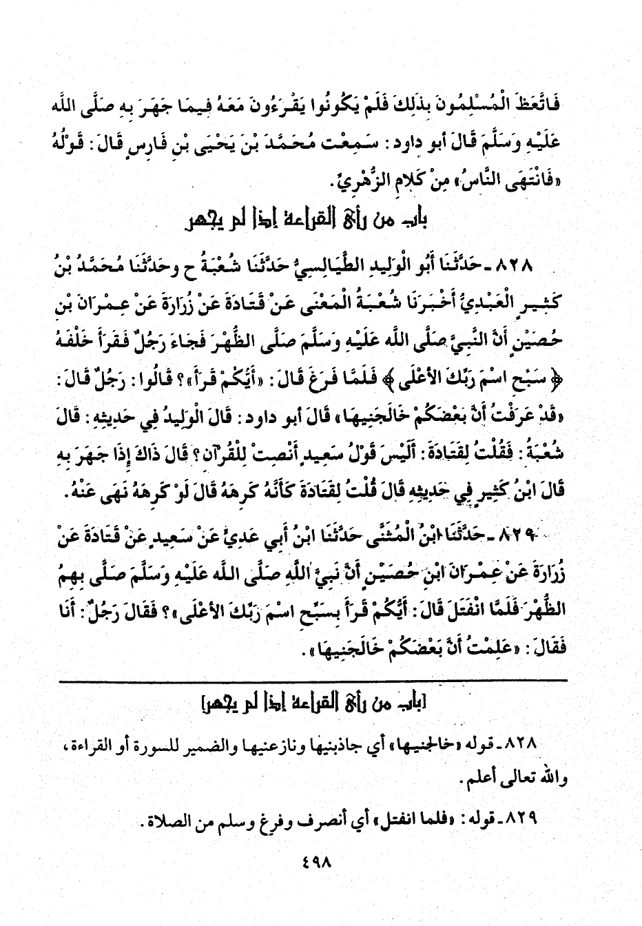 828 - حَدَّثَنَا أَبُو الْوَلِيدِ الطَّيَالِسِيُّ، حَدَّثَنَا شُعْبَةُ، ح وَحَدَّثَنَا مُحَمَّدُ بْنُ كَثِيرٍ الْعَبْدِيُّ، أَخْبَرَنَا شُعْبَةُ الْمَعْنَى، عَنْ قَتَادَةَ، عَنْ زُرَارَةَ، عَنْ عِمْرَانَ بْنِ حُصَيْنٍ، أَنَّ النَّبِيَّ صَلَّى اللهُ عَلَيْهِ وَسَلَّمَ صَلَّى الظُّهْرَ فَجَاءَ رَجُلٌ فَقَرَأَ خَلْفَهُ سَبِّحِ اسْمَ رَبِّكَ الْأَعْلَى فَلَمَّا فَرَغَ، قَالَ: «أَيُّكُمْ قَرَأَ؟ »، قَالُوا: رَجُلٌ، قَالَ: «قَدْ عَرَفْتُ أَنَّ بَعْضَكُمْ خَالَجَنِيهَا»، قَالَ أَبُو دَاوُدَ: قَالَ أَبُو الْوَلِيدُ فِي حَدِيثِهِ: قَالَ شُعْبَةُ: فَقُلْتُ لِقَتَادَةَ: أَلَيْسَ قَوْلُ سَعِيدٍ أَنْصِتْ لِلْقُرْآنِ؟ قَالَ: ذَاكَ إِذَا جَهَرَ بِهِ، قَالَ ابْنُ كَثِيرٍ فِي حَدِيثِهِ: قَالَ: قُلْتُ لِقَتَادَةَ: كَأَنَّهُ كَرِهَهُ قَالَ: لَوْ كَرِهَهُ نَهَى عَنْهُ.