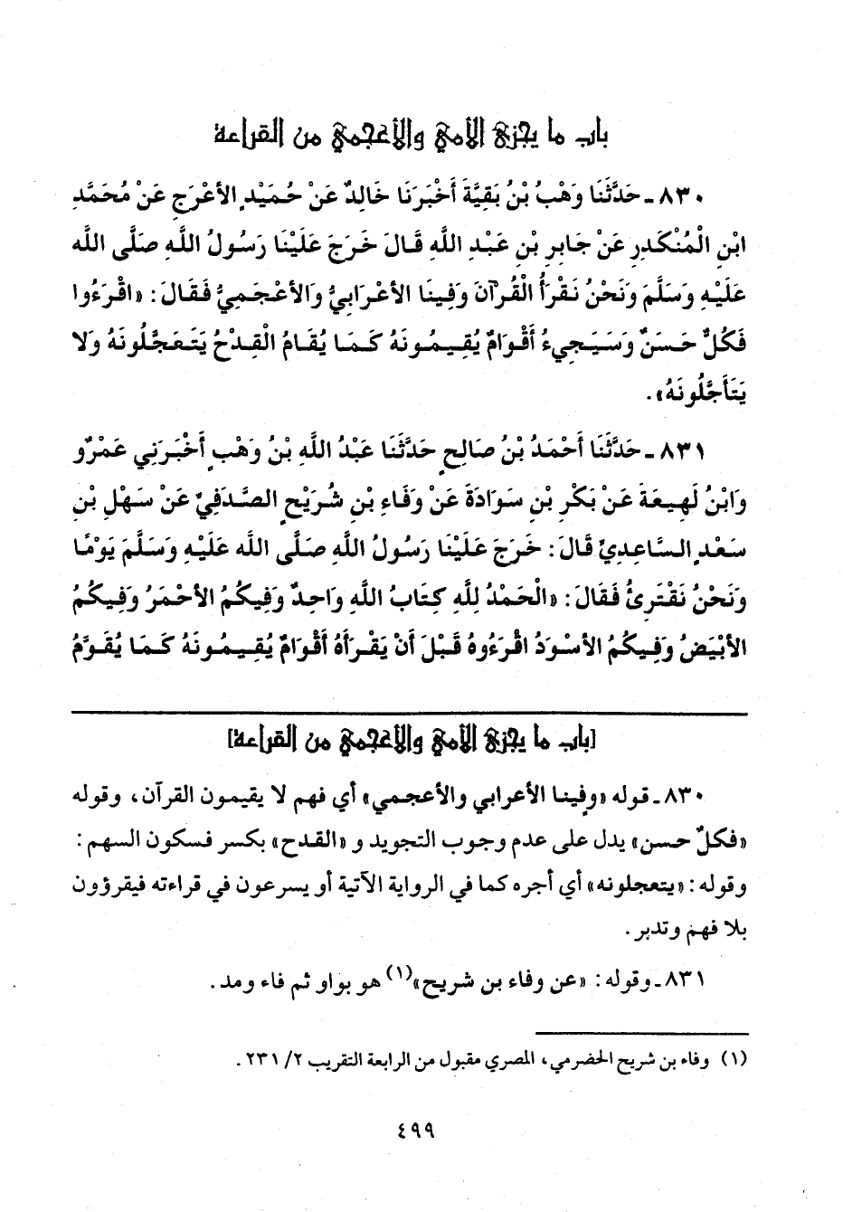 830 - حَدَّثَنَا وَهْبُ بْنُ بَقِيَّةَ، أَخْبَرَنَا خَالِدٌ، عَنْ حُمَيْدٍ الْأَعْرَجِ، عَنْ مُحَمَّدِ بْنِ الْمُنْكَدِرِ، عَنْ جَابِرِ بْنِ عَبْدِ اللَّهِ، قَالَ: خَرَجَ عَلَيْنَا رَسُولُ اللَّهِ صَلَّى اللهُ عَلَيْهِ وَسَلَّمَ وَنَحْنُ نَقْرَأُ الْقُرْآنَ وَفِينَا الْأَعْرَابِيُّ وَالْأَعْجَمِيُّ، فَقَالَ: «اقْرَءُوا فَكُلٌّ حَسَنٌ وَسَيَجِيءُ أَقْوَامٌ يُقِيمُونَهُ كَمَا يُقَامُ الْقِدْحُ يَتَعَجَّلُونَهُ وَلَا يَتَأَجَّلُونَهُ».