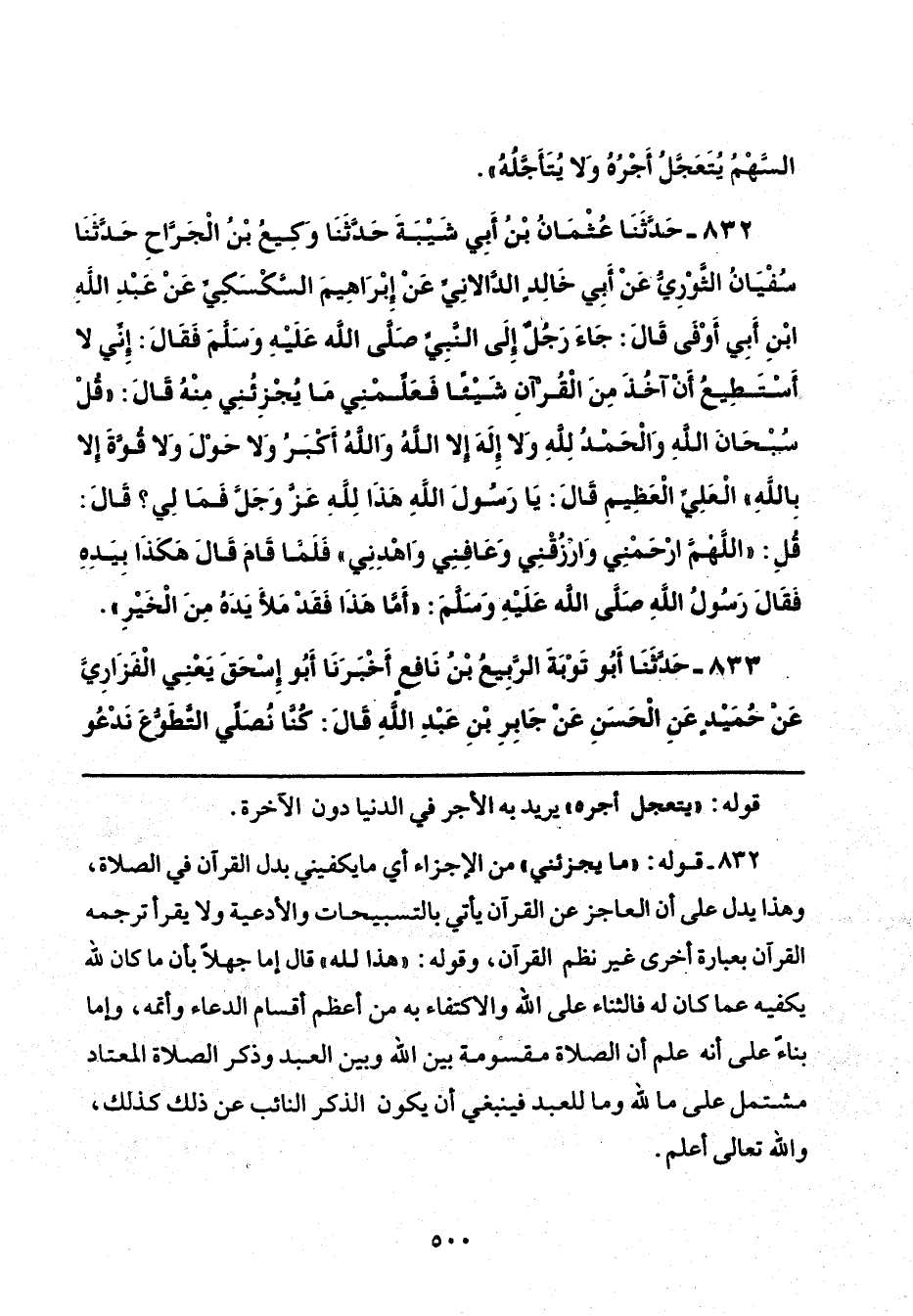 832 - قوله: "ما يجزئني" من الإجزاء أي ما يكفيني بدل القرآن في الصلاة، وهذا يدل على أن العاجز عن القرآن يأتي بالتسبيحات والأدعية ولا يقرأ ترجمه القرآن بعبارة أخرى غير نظم القرآن، وقوله: "هذا لله" قال إما جهلًا بأن ما كان لله يكفيه عما كان له فالثناء على الله والاكتفاء به من أعظم أقسام الدعاء وأتمه، وإما بناءً على أنه علم أن الصلاة مقسومة بين الله وبين العبد وذكر الصلاة المعتاد مشتمل على ما لله وما للعبد فينبغي أن يكون الذكر النائب عن ذلك كذلك، والله تعالى أعلم.