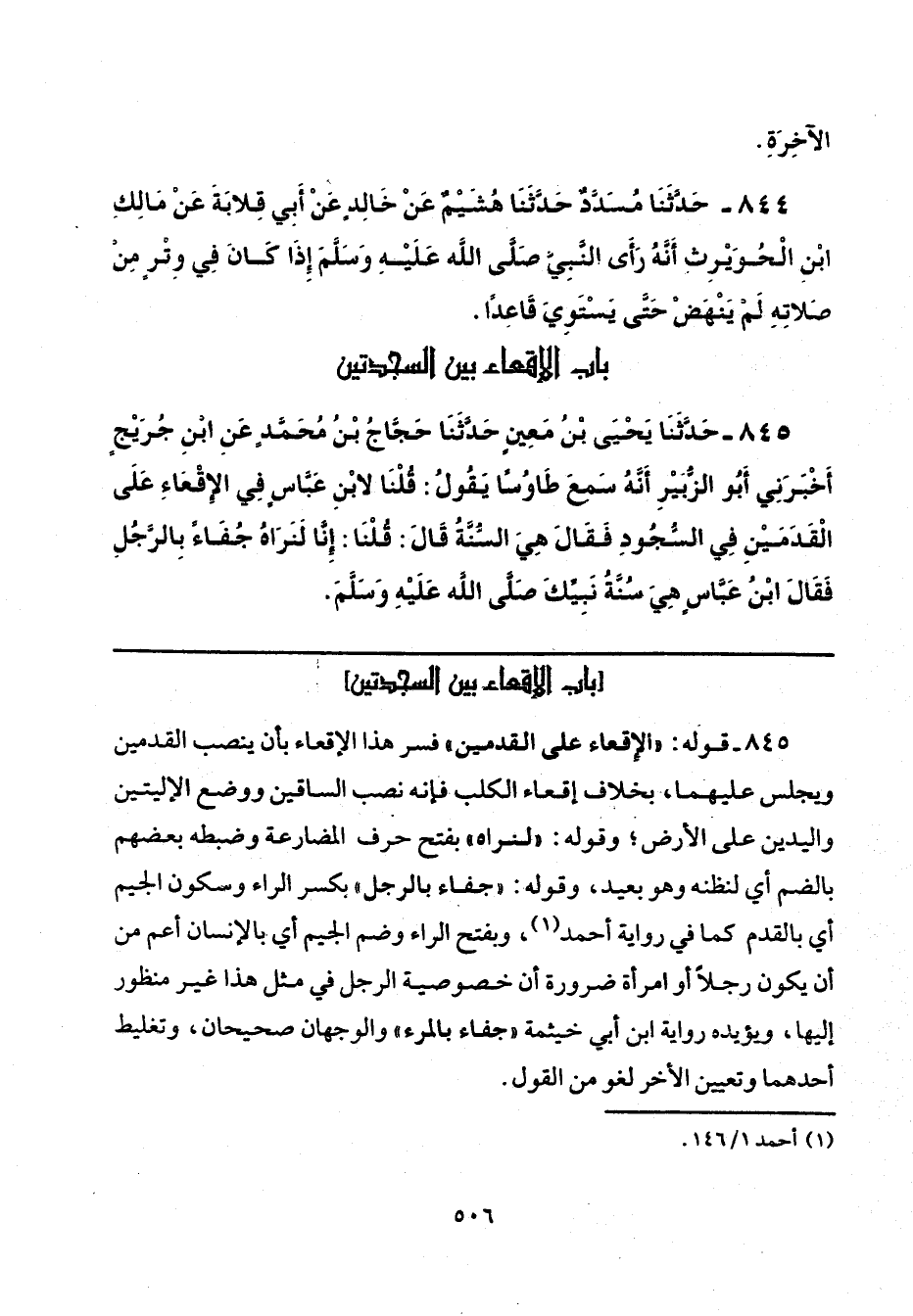 845 - قوله: "الإقعاء على القدمين" فسر هذا الإقعاء بأن ينصب القدمين ويجلس عليهما، بخلاف إقعاء الكلب فإنه نصب الساقين ووضع الإليتين واليدين على الأرض؛ وقوله: "لنراه" بفتح حرف المضارعة وضبطه بعضهم بالضم أي لنظنه وهو بيد، وقوله: "جفاء بالرجل" بكسر الراء وسكون الجيم أي بالقدم كما في رواية أحمد (¬1)، وبفتح الراء وضم الجيم أي بالإنسان أعم من أن يكون رجلًا أو امرأة ضرورة أن خصوصية الرجل في مثل هذا غير منظور إليها، ويؤيده رواية ابن أبي خيثمة "جفاء بالمرء" والوجهان صحيحان، وتغليط أحدهما وتعيين الأخر لغو من القول.