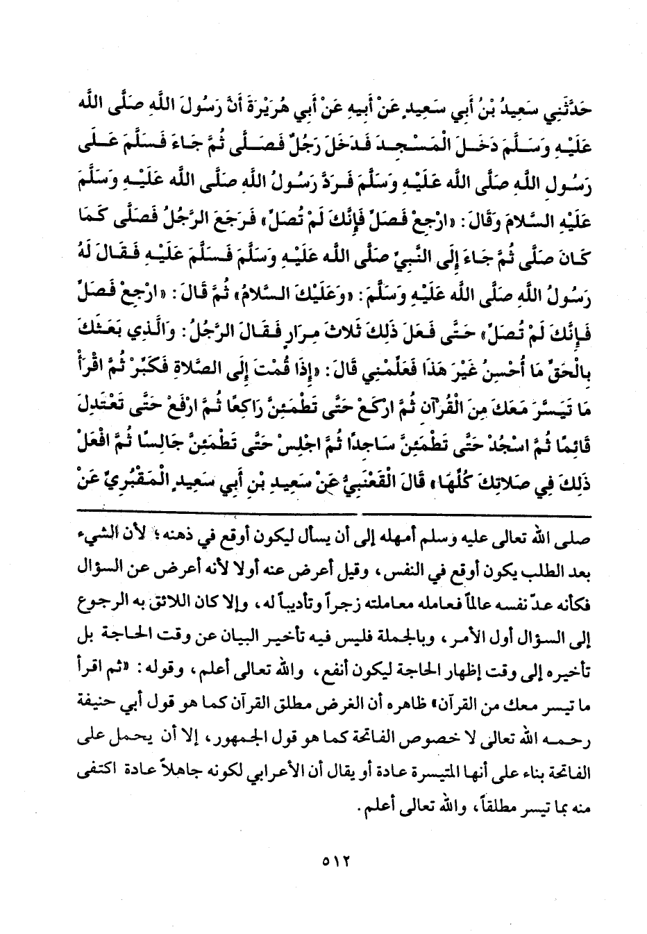 حَدَّثَنِي سَعِيدُ بْنُ أَبِي سَعِيدٍ، عَنْ أَبِيهِ، عَنْ أَبِي هُرَيْرَةَ، أَنَّ رَسُولَ اللَّهِ صَلَّى اللهُ عَلَيْهِ وَسَلَّمَ دَخَلَ الْمَسْجِدَ، فَدَخَلَ رَجُلٌ، فَصَلَّى ثُمَّ جَاءَ فَسَلَّمَ عَلَى رَسُولِ اللَّهِ صَلَّى اللهُ عَلَيْهِ وَسَلَّمَ، فَرَدَّ رَسُولُ اللَّهِ صَلَّى اللهُ عَلَيْهِ وَسَلَّمَ عَلَيْهِ السَّلَامَ، وَقَالَ: «ارْجِعْ فَصَلِّ، فَإِنَّكَ لَمْ تُصَلِّ»، فَرَجَعَ الرَّجُلُ، فَصَلَّى كَمَا كَانَ صَلَّى، ثُمَّ جَاءَ إِلَى النَّبِيِّ صَلَّى اللهُ عَلَيْهِ وَسَلَّمَ، فَسَلَّمَ عَلَيْهِ، فَقَالَ لَهُ رَسُولُ اللَّهِ صَلَّى اللهُ عَلَيْهِ وَسَلَّمَ: «وَعَلَيْكَ السَّلَامُ»، ثُمَّ قَالَ: «ارْجِعْ فَصَلِّ، فَإِنَّكَ لَمْ تُصَلِّ»، حَتَّى فَعَلَ ذَلِكَ ثَلَاثَ مِرَارٍ، فَقَالَ الرَّجُلُ: وَالَّذِي بَعَثَكَ بِالْحَقِّ، مَا أُحْسِنُ غَيْرَ هَذَا فَعَلِّمْنِي، قَالَ: «إِذَا قُمْتَ إِلَى الصَّلَاةِ فَكَبِّرْ، ثُمَّ اقْرَأْ مَا تَيَسَّرَ مَعَكَ مِنَ الْقُرْآنِ، ثُمَّ ارْكَعْ حَتَّى تَطْمَئِنَّ رَاكِعًا، ثُمَّ ارْفَعْ حَتَّى تَعْتَدِلَ قَائِمًا، ثُمَّ اسْجُدْ حَتَّى تَطْمَئِنَّ سَاجِدًا، ثُمَّ اجْلِسْ حَتَّى تَطْمَئِنَّ جَالِسًا، ثُمَّ افْعَلْ ذَلِكَ فِي صَلَاتِكَ كُلِّهَا»، قَالَ الْقَعْنَبِيُّ، عَنْ سَعِيدِ بْنِ أَبِي سَعِيدٍ الْمَقْبُرِيِّ، عَنْ