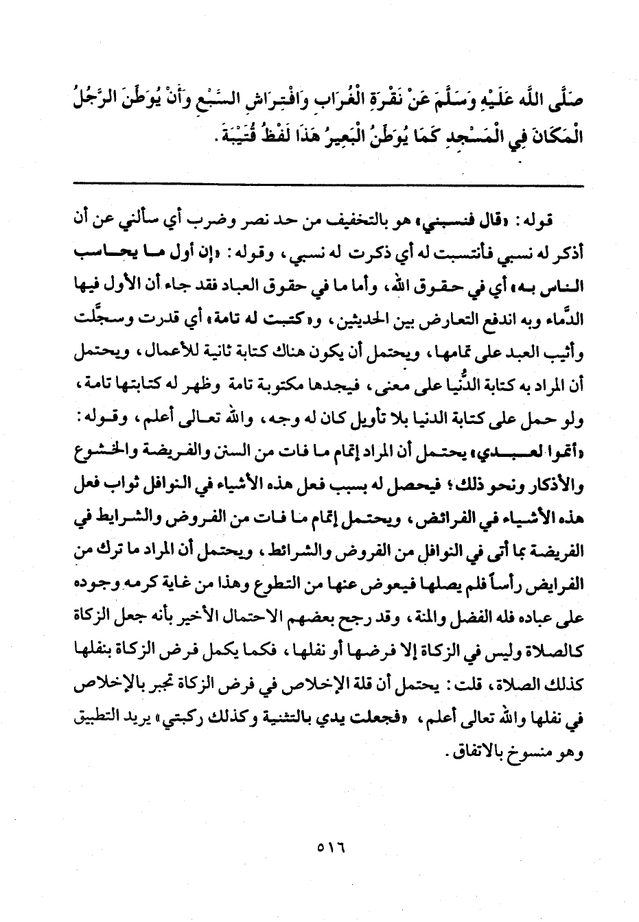 صَلَّى اللهُ عَلَيْهِ وَسَلَّمَ عَنْ نَقْرَةِ الْغُرَابِ، وَافْتِرَاشِ السَّبْعِ، وَأَنْ يُوَطِّنَ الرَّجُلُ الْمَكَانَ فِي الْمَسْجِدِ كَمَا يُوَطِّنُ الْبَعِيرُ»، هَذَا لَفْظُ قتَيْبَةَ.