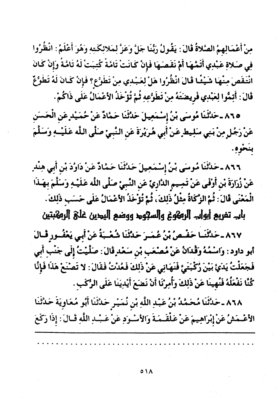 866 - حَدَّثَنَا مُوسَى بْنُ إِسْمَاعِيلَ، حَدَّثَنَا حَمَّادٌ، عَنْ دَاوُدَ بْنِ أَبِي هِنْدٍ، عَنْ زُرَارَةَ بْنِ أَوْفَى، عَنْ تَمِيمٍ الدَّارِيِّ، عَنِ النَّبِيِّ صَلَّى اللهُ عَلَيْهِ وَسَلَّمَ بِهَذَا الْمَعْنَى، قَالَ: ثُمَّ الزَّكَاةُ مِثْلُ ذَلِكَ، ثُمَّ تُؤْخَذُ الْأَعْمَالُ عَلَى حَسَبِ ذَلِكَ.