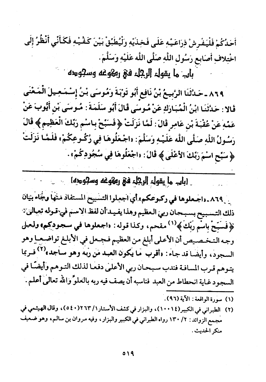 869 - "اجعلوها في ركوعكم" أي اجعلوا التسبيح المستفاد منها وجاء بيان ذلك التسبيح بسبحان ربي العظيم وهذا يفيد أن لفظ الاسم في قوله تعالى {فَسَبِّحْ بِاسْمِ رَبِّكَ الْعَظِيمِ} (¬1) مقحم، وكذا قوله: "اجعلوها في سجودكم" ولعل وجه التخصيص أن الأعلى أبلغ من العظيم فجعل في الأبلغ تواضعًا وهو السجود، وأيضًا قد جاء: "أقرب ما يكون العبد من ربه وهو ساجد" (¬2) فربما يتوهم قرب المسافة فندب سبحان ربي الأعلى دفعا لذلك التوهم وأيضًا في السجود غاية انحطاط من العبد فناسبه أن يصف فيه ربه بالعلوِّ والله تعالى أعلم.