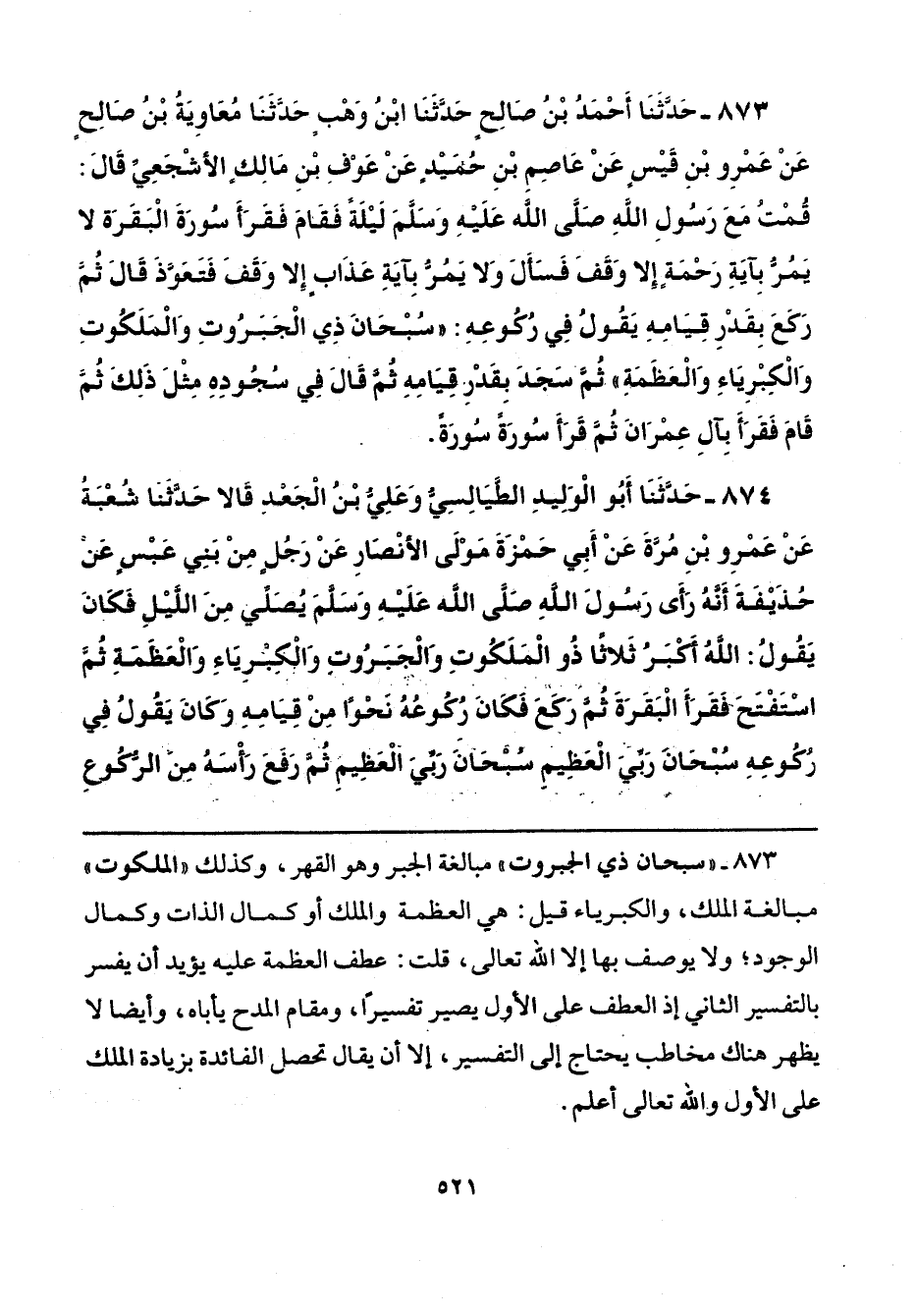 873 - حَدَّثَنَا أَحْمَدُ بْنُ صَالِحٍ، حَدَّثَنَا ابْنُ وَهْبٍ، حَدَّثَنَا مُعَاوِيَةُ بْنُ صَالِحٍ، عَنْ عَمْرِو بْنِ قَيْسٍ، عَنْ عَاصِمِ بْنِ حُمَيْدٍ، عَنْ عَوْفِ بْنِ مَالِكٍ الْأَشْجَعِيِّ، قَالَ: قُمْتُ مَعَ رَسُولِ اللَّهِ صَلَّى اللهُ عَلَيْهِ وَسَلَّمَ لَيْلَةً، فَقَامَ فَقَرَأَ سُورَةَ الْبَقَرَةِ، لَا يَمُرُّ بِآيَةِ رَحْمَةٍ إِلَّا وَقَفَ فَسَأَلَ، وَلَا يَمُرُّ بِآيَةِ عَذَابٍ إِلَّا وَقَفَ فَتَعَوَّذَ، قَالَ: ثُمَّ رَكَعَ بِقَدْرِ قِيَامِهِ، يَقُولُ فِي رُكُوعِهِ: «سُبْحَانَ ذِي الْجَبَرُوتِ وَالْمَلَكُوتِ وَالْكِبْرِيَاءِ وَالْعَظَمَةِ»، ثُمَّ سَجَدَ بِقَدْرِ قِيَامِهِ، ثُمَّ قَالَ فِي سُجُودِهِ مِثْلَ ذَلِكَ، ثُمَّ قَامَ فَقَرَأَ بِآلِ عِمْرَانَ، ثُمَّ قَرَأَ سُورَةً سُورَةً.