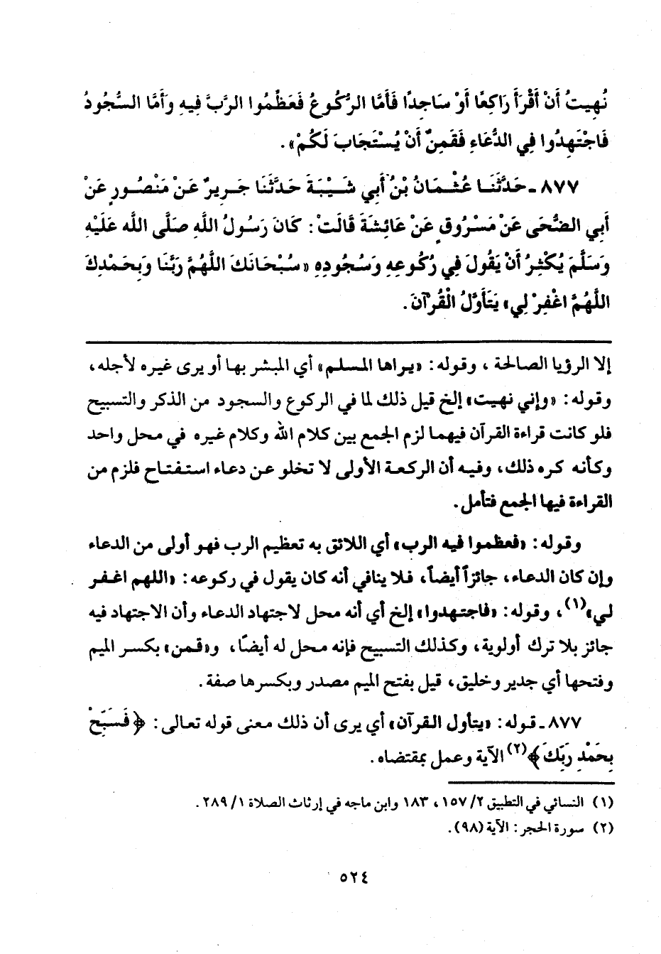 877 - حَدَّثَنَا عُثْمَانُ بْنُ أَبِي شَيْبَةَ، حَدَّثَنَا جَرِيرٌ، عَنْ مَنْصُورٍ، عَنْ أَبِي الضُّحَى، عَنْ مَسْرُوقٍ، عَنْ عَائِشَةَ، قَالَتْ: كَانَ رَسُولُ اللَّهِ صَلَّى اللهُ عَلَيْهِ وَسَلَّمَ: يُكْثِرُ أَنْ يَقُولَ فِي رُكُوعِهِ وَسُجُودِهِ: «سُبْحَانَكَ اللَّهُمَّ رَبَّنَا وَبِحَمْدِكَ، اللَّهُمَّ اغْفِرْ لِي يَتَأَوَّلُ الْقُرْآنَ».