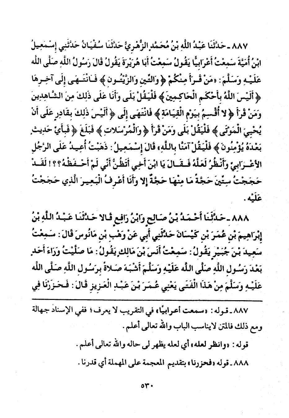 887 - حَدَّثَنَا عَبْدُ اللَّهِ بْنُ مُحَمَّدٍ الزُّهْرِيُّ، حَدَّثَنَا سُفْيَانُ، حَدَّثَنِي إِسْمَاعِيلُ بْنُ أُمَيَّةَ، سَمِعْتُ أَعْرَابِيًّا يَقُولُ: سَمِعْتُ أَبَا هُرَيْرَةَ يَقُولُ: قَالَ رَسُولُ اللَّهِ صَلَّى اللهُ عَلَيْهِ وَسَلَّمَ: " مَنْ قَرَأَ مِنْكُمْ وَالتِّينِ وَالزَّيْتُونِ، فَانْتَهَى إِلَى آخِرِهَا: {أَلَيْسَ اللَّهُ بِأَحْكَمِ الْحَاكِمِينَ} [التين: 8]، فَلْيَقُلْ: بَلَى، وَأَنَا عَلَى ذَلِكَ مِنَ الشَّاهِدِينَ، وَمَنْ قَرَأَ: لَا أُقْسِمُ بِيَوْمِ الْقِيَامَةِ، فَانْتَهَى إِلَى {أَلَيْسَ ذَلِكَ بِقَادِرٍ عَلَى أَنْ يُحْيِيَ الْمَوْتَى} [القيامة: 40]، فَلْيَقُلْ: بَلَى، وَمَنْ قَرَأَ: وَالْمُرْسَلَاتِ، فَبَلَغَ: {فَبِأَيِّ حَدِيثٍ بَعْدَهُ يُؤْمِنُونَ} [المرسلات: 50]، فَلْيَقُلْ: آمَنَّا بِاللَّهِ "، قَالَ إِسْمَاعِيلُ: ذَهَبْتُ أُعِيدُ عَلَى الرَّجُلِ الْأَعْرَابِيِّ، وَأَنْظُرُ لَعَلَّهُ، فَقَالَ: «يَا ابْنَ أَخِي، أَتَظُنُّ أَنِّي لَمْ أَحْفَظْهُ، لَقَدْ حَجَجْتُ سِتِّينَ حَجَّةً، مَا مِنْهَا حَجَّةٌ إِلَّا وَأَنَا أَعْرِفُ الْبَعِيرَ الَّذِي حَجَجْتُ عَلَيْهِ».
