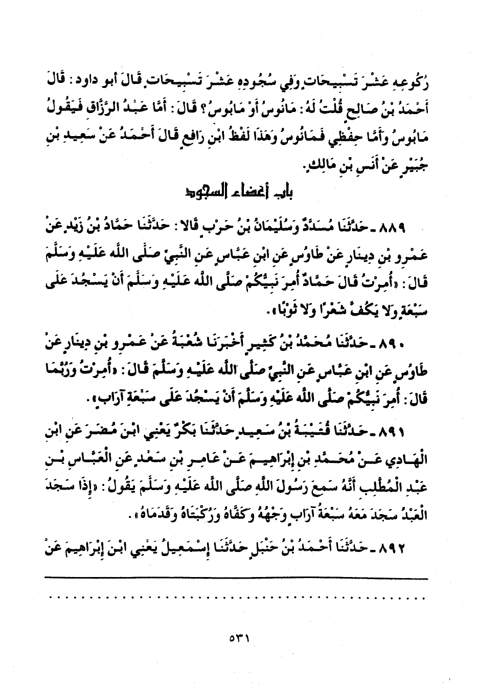 891 - حَدَّثَنَا قُتَيْبَةُ بْنُ سَعِيدٍ، حَدَّثَنَا بَكْرٌ يَعْنِي ابْنَ مُضَرَ، عَنِ ابْنِ الْهَادِي، عَنْ مُحَمَّدِ بْنِ إِبْرَاهِيمَ، عَنْ عَامِرِ بْنِ سَعْدٍ، عَنِ الْعَبَّاسِ بْنِ عَبْدِ الْمُطَّلِبِ، أَنَّهُ سَمِعَ رَسُولَ اللَّهِ صَلَّى اللهُ عَلَيْهِ وَسَلَّمَ يَقُولُ: «إِذَا سَجَدَ الْعَبْدُ سَجَدَ مَعَهُ سَبْعَةُ آرَابٍ، وَجْهُهُ، وَكَفَّاهُ، وَرُكْبَتَاهُ، وَقَدَمَاهُ».