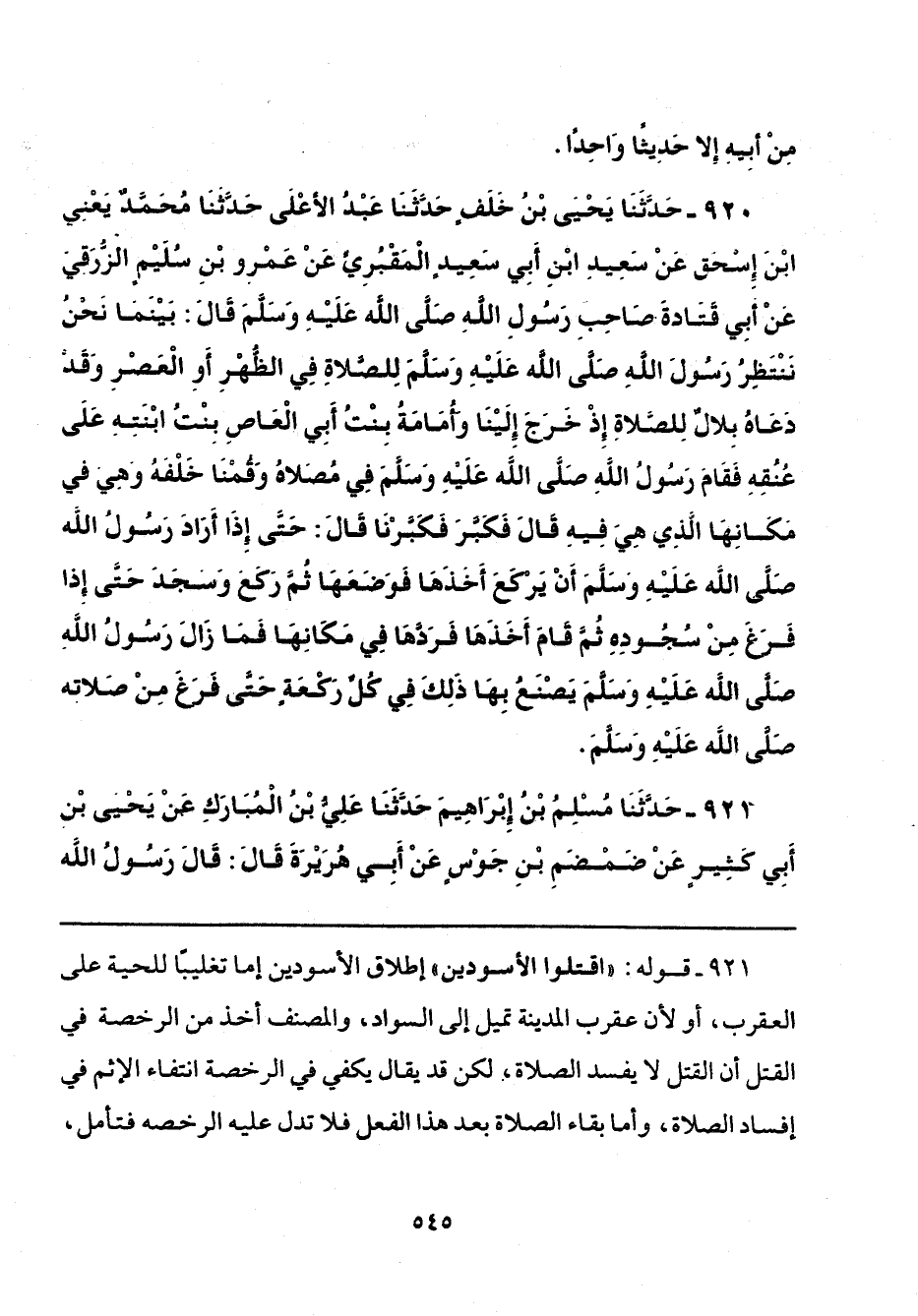 921 - قوله: "اقتلوا الأسودين" إطلاق الأسودين إما تغليبًا للحية على العقرب، أو لأنَّ عقرب المدينة تميل إلى السواد، والمصنف أخذ من الرخصة في القتل أن القتل لا يفسد الصَّلاة، لكن قد يقال يكفي في الرخصة انتفاء الاثم في إفساد الصَّلاة، وأمَّا بقاء الصَّلاة بعد هذا الفعل فلا تدل عليه الرخصه فتأمل،