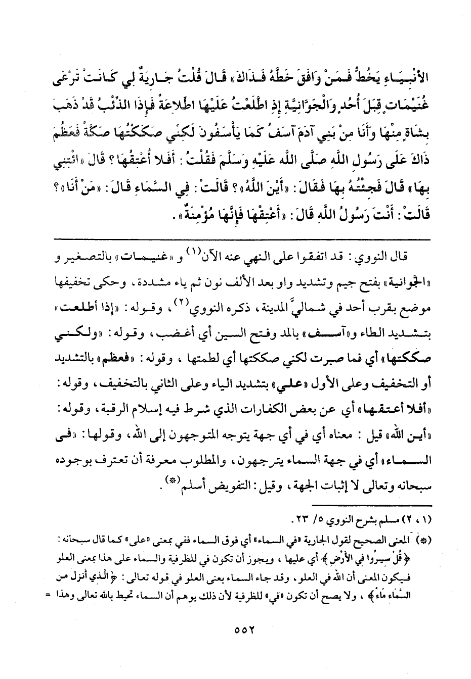 قال النووي: قد اتفقوا على النَّهي عنه الآن (¬1) و "غنيمات" بالتصغير و "الجَّوانية"، بفتح جيم وتشديد واو بعد الألف نون ثم ياء مشددة، وحكى تخفيفها موضع بقرب أحد في شماليَّ المدينة، ذكره النووي (¬2)، وقوله: "إذا أطلعت" بتشديد الطاء و"آسف" بالمد وفتح السِّين أي أغضب، وقوله: "ولكني صككتها" أي فما صبرت لكني صككتها أي لطمتها، وقوله: "فعظم" بالتشديد أو التخفيف وعلي الأول "عليّ" بتشديد الياء وعلى الثَّاني بالتخفيف، وقوله: "أفلا أعتقها" أي عن بعض الكفارات الذي شرط فيه إسلام الرقبة، وقوله: "أين الله" قيل: معناه أي في أي جهة يتوجه المتوجهون إلى الله، وقولها: "في السماء" أي في جهة السماء يتوجهون، والمطلوب معرفة أن تعترف بوجوده سبحانه وتعالى لا إثبات الجهة، وقيل: التفويض أسلم (*).