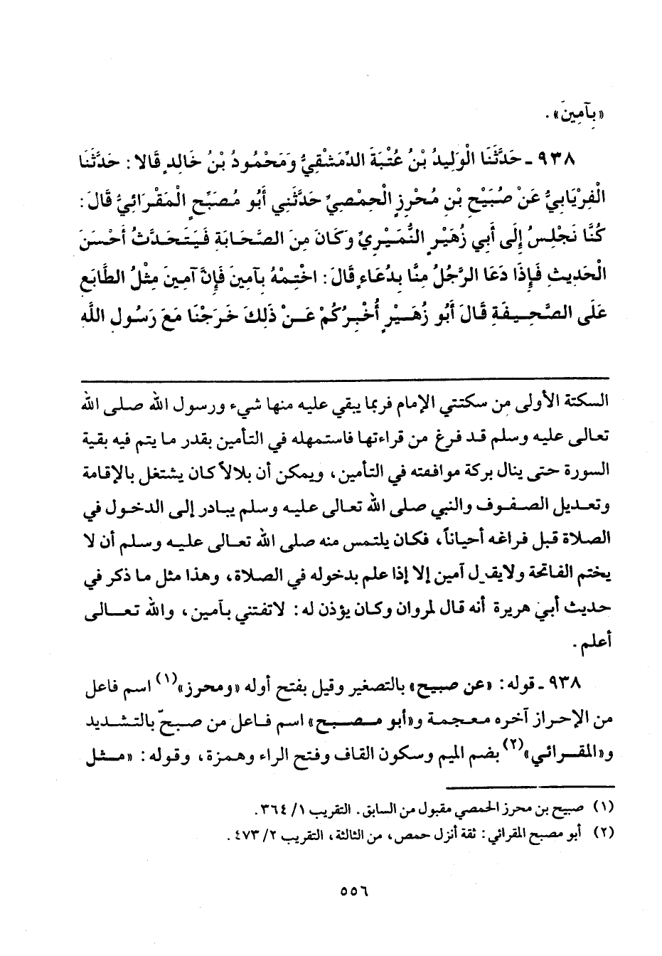 938 - حَدَّثَنَا الْوَلِيدُ بْنُ عُتْبَةَ الدِّمَشْقِيُّ، وَمَحْمُودُ بْنُ خَالِدٍ، قَالَا: حَدَّثَنَا الْفِرْيَابِيُّ، عَنْ صُبَيْحِ بْنِ مُحْرِزٍ الْحِمْصِيِّ، حَدَّثَنِي أَبُو مُصَبِّحٍ الْمَقْرَائِيُّ، قَالَ: كُنَّا نَجْلِسُ إِلَى أَبِي زُهَيْرٍ النُّمَيْرِيِّ، وَكَانَ مِنَ الصَّحَابَةِ، فَيَتَحَدَّثُ أَحْسَنَ الْحَدِيثِ، فَإِذَا دَعَا الرَّجُلُ مِنَّا بِدُعَاءٍ قَالَ: اخْتِمْهُ بِآمِينَ، فَإِنَّ آمِينَ مِثْلُ الطَّابَعِ عَلَى الصَّحِيفَةِ، قَالَ أَبُو زُهَيْرٍ: أُخْبِرُكُمْ عَنْ ذَلِكَ؟ خَرَجْنَا مَعَ رَسُولِ اللَّهِ