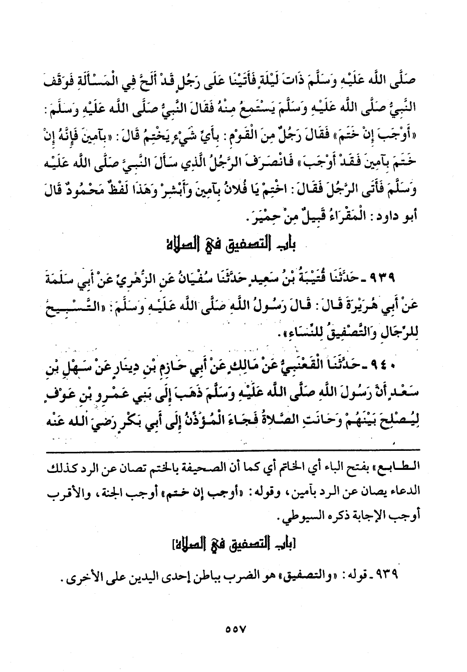 939 - حَدَّثَنَا قُتَيْبَةُ بْنُ سَعِيدٍ، حَدَّثَنَا سُفْيَانُ، عَنِ الزُّهْرِيِّ، عَنْ أَبِي سَلَمَةَ، عَنْ أَبِي هُرَيْرَةَ، قَالَ: قَالَ رَسُولُ اللَّهِ صَلَّى اللهُ عَلَيْهِ وَسَلَّمَ: «التَّسْبِيحُ لِلرِّجَالِ، وَالتَّصْفِيقُ لِلنِّسَاءِ».