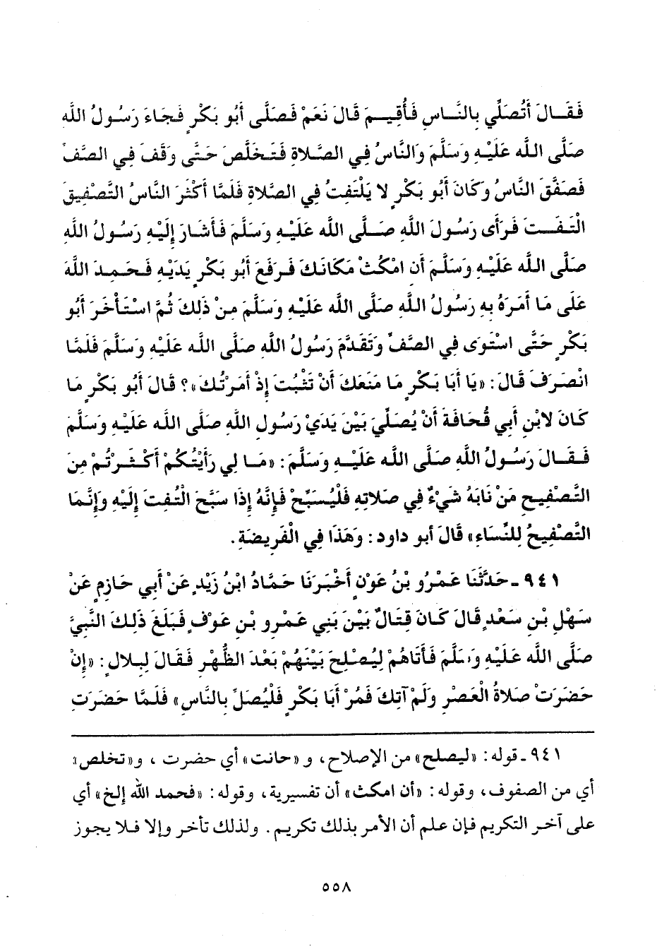 941 - حَدَّثَنَا عَمْرُو بْنُ عَوْنٍ، أَخْبَرَنَا حَمَّادُ بْنُ زَيْدٍ، عَنْ أَبِي حَازِمٍ، عَنْ سَهْلِ بْنِ سَعْدٍ، قَالَ: كَانَ قِتَالٌ بَيْنَ بَنِي عَمْرِو بْنِ عَوْفٍ، فَبَلَغَ ذَلِكَ النَّبِيَّ صَلَّى اللهُ عَلَيْهِ وَسَلَّمَ، فَأَتَاهُمْ لِيُصْلِحَ بَيْنَهُمْ بَعْدَ الظُّهْرِ، فَقَالَ لِبِلَالٍ: «إِنْ حَضَرَتْ صَلَاةُ الْعَصْرِ وَلَمْ آتِكَ، فَمُرْ أَبَا بَكْرٍ، فَلْيُصَلِّ بِالنَّاسِ»، فَلَمَّا حَضَرَتِ