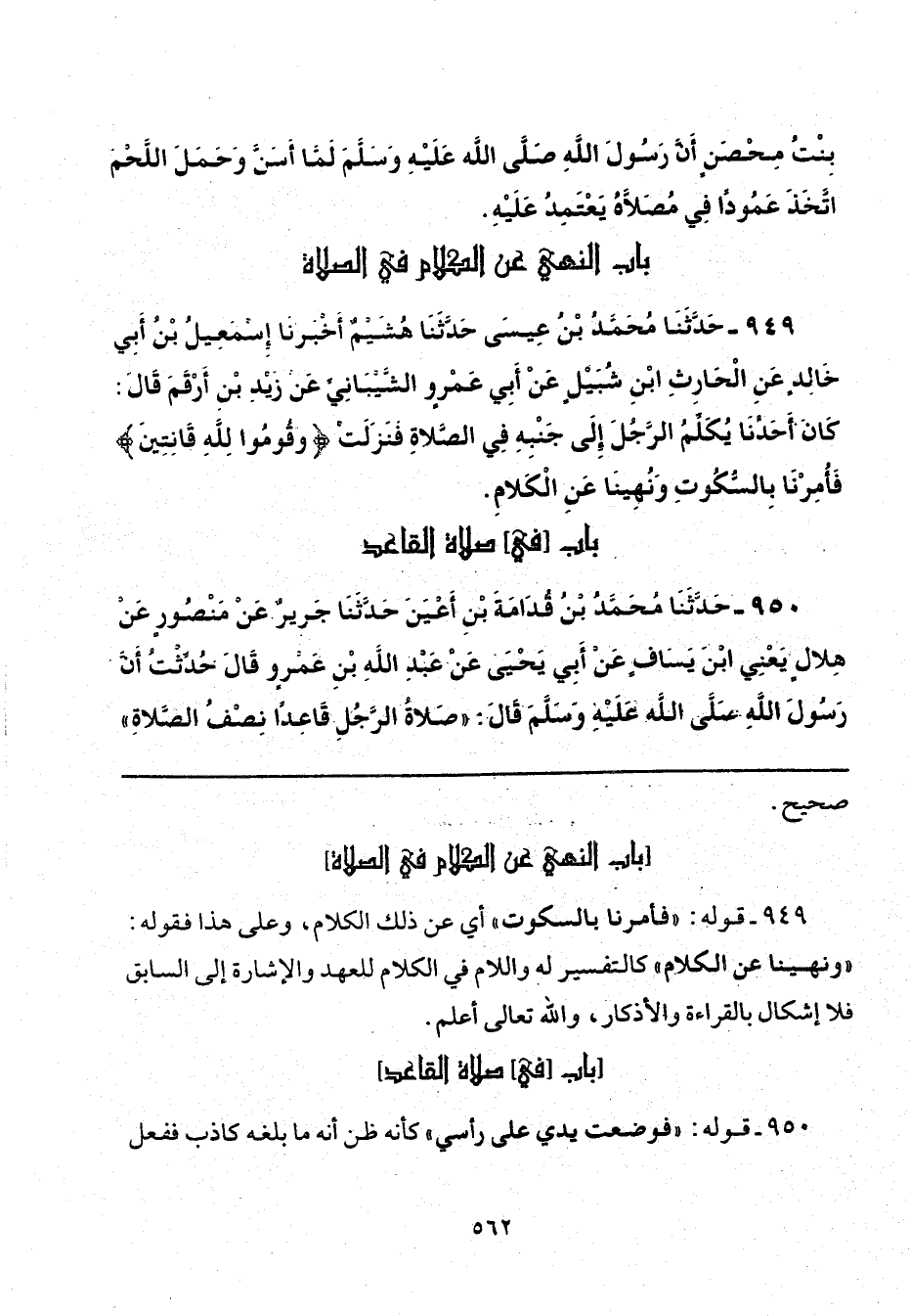 949 - حَدَّثَنَا مُحَمَّدُ بْنُ عِيسَى، حَدَّثَنَا هُشَيْمٌ، أَخْبَرَنَا إِسْمَاعِيلُ بْنُ أَبِي خَالِدٍ، عَنِ الْحَارِثِ بْنِ شُبَيْلٍ، عَنْ أَبِي عَمْرٍو الشَّيْبَانِيِّ، عَنْ زَيْدِ بْنِ أَرْقَمَ، قَالَ: "كَانَ أَحَدُنَا يُكَلِّمُ الرَّجُلَ إِلَى جَنْبِهِ فِي الصَّلَاةِ، فَنَزَلَتْ: {وَقُومُوا لِلَّهِ قَانِتِينَ} [البقرة: 238]، فَأُمِرْنَا بِالسُّكُوتِ، وَنُهِينَا عَنِ الْكَلَامِ".
