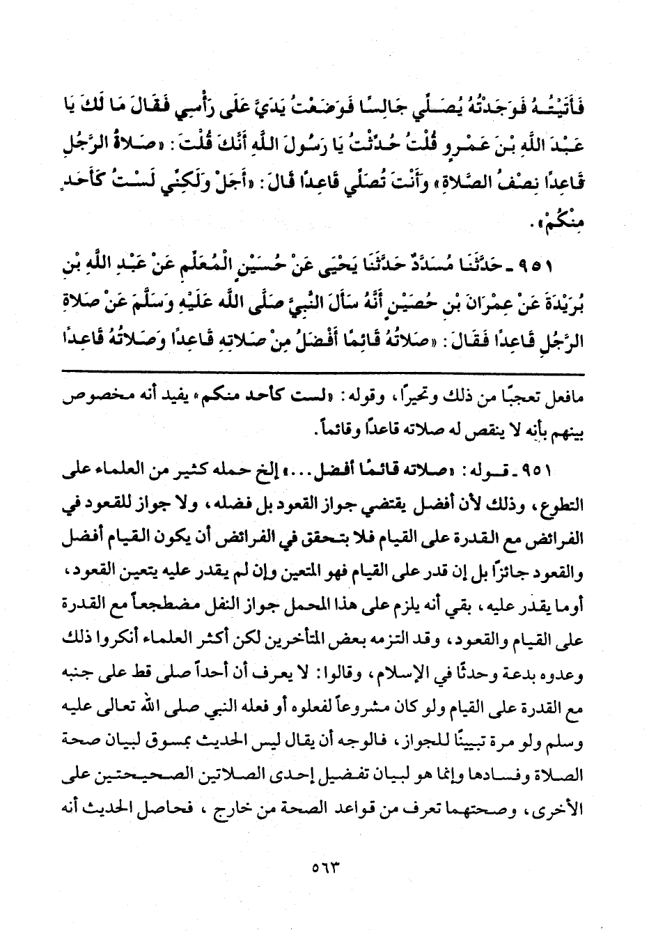 951 - قوله: "صلاته قائمًا أفضل ... " إلخ حمله كثير من العلماء على التطوع، وذلك لأنَّ أفضل يقتضي جواز القعود بل فضله، ولا جواز للقعود في الفرائض مع القدرة على القيام فلا يتحقق في الفرائض أن يكون القيام أفضل والقعود جائزًا بل إن قدر على القيام فهو المتعين وإن لم يقدر عليه يتعين القعود، أو ما يقدر عليه، بقي أنه يلزم على هذا المحمل جواز النفل مضطجعًا مع القدرة على القيام والقعود، وقد التزمه بعض المتأخرين لكن أكثر العلماء أنكروا ذلك وعدوه بدعة وحدثًا في الإسلام، وقالوا: لا يعرف أن أحدًا صَلَّى قط على جنبه مع القدرة على القيام ولو كان مشروعًا لفعلوه أو فعله النَّبيُّ صَلَّى الله تعالى عليه وسلم ولو مرَّة تبيينًا للجواز، فالوجه أن يقال ليس الحديث بمسوق لبيان صحة الصَّلاة وفسادها وإنَّما هو لبيان تفضيل إحدى الصلاتين الصحيحتين على الأخرى، وصحتهما تعرف من قواعد الصحة من خارج، فحاصل الحديث أنه