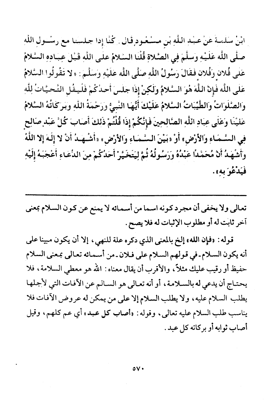 بْنُ سَلَمَةَ، عَنْ عَبْدِ اللَّهِ بْنِ مَسْعُودٍ، قَالَ: كُنَّا إِذَا جَلَسْنَا مَعَ رَسُولِ اللَّهِ صَلَّى اللهُ عَلَيْهِ وَسَلَّمَ فِي الصَّلَاةِ قُلْنَا: السَّلَامُ عَلَى اللَّهِ قَبْلَ عِبَادِهِ، السَّلَامُ عَلَى فُلَانٍ وَفُلَانٍ، فَقَالَ رَسُولُ اللَّهِ صَلَّى اللهُ عَلَيْهِ وَسَلَّمَ: "لَا تَقُولُوا: السَّلَامُ عَلَى اللَّهِ، فَإِنَّ اللَّهَ هُوَ السَّلَامُ، وَلَكِنْ إِذَا جَلَسَ أَحَدُكُمْ فَلْيَقُلْ: التَّحِيَّاتُ لِلَّهِ، وَالصَّلَوَاتُ، وَالطَّيِّبَاتُ، السَّلَامُ عَلَيْكَ أَيُّهَا النَّبِيُّ وَرَحْمَةُ اللَّهِ وَبَرَكَاتُهُ، السَّلَامُ عَلَيْنَا وَعَلَى عِبَادِ اللَّهِ الصَّالِحِينَ، فَإِنَّكُمْ إِذَا قُلْتُمْ ذَلِكَ أَصَابَ كُلَّ عَبْدٍ صَالِحٍ فِي السَّمَاءِ وَالْأَرْضِ - أَوْ بَيْنَ السَّمَاءِ وَالْأَرْضِ - أَشْهَدُ أَنْ لَا إِلَهَ إِلَّا اللَّهُ، وَأَشْهَدُ أَنَّ مُحَمَّدًا عَبْدُهُ وَرَسُولُهُ، ثُمَّ لِيَتَخَيَّرْ أَحَدُكُمْ مِنَ الدُّعَاءِ أَعْجَبَهُ إِلَيْهِ فَيَدْعُوَ بِهِ".