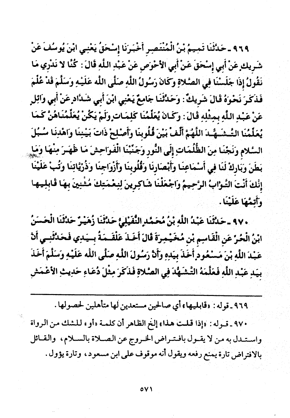 969 - حَدَّثَنَا تَمِيمُ بْنُ الْمُنْتَصِرِ، أَخْبَرَنَا إِسْحَاقُ يَعْنِي ابْنَ يُوسُفَ، عَنْ شَرِيكٍ، عَنْ أَبِي إِسْحَاقَ، عَنْ أَبِي الْأَحْوَصِ، عَنْ عَبْدِ اللَّهِ، قَالَ: كُنَّا لَا نَدْرِي مَا نَقُولُ إِذَا جَلَسْنَا فِي الصَّلَاةِ، وَكَانَ رَسُولُ اللَّهِ صَلَّى اللهُ عَلَيْهِ وَسَلَّمَ قَدْ عُلِّمَ فَذَكَرَ نَحْوَهُ، قَالَ شَرِيكٌ: وَحَدَّثَنَا جَامِعٌ يَعْنِي ابْنَ أَبِي شَدَّادٍ، عَنْ أَبِي وَائِلٍ، عَنْ عَبْدِ اللَّهِ، بِمِثْلِهِ، قَالَ: وَكَانَ يُعَلِّمُنَا كَلِمَاتٍ وَلَمْ يَكُنْ يُعَلِّمُنَاهُنَّ كَمَا يُعَلِّمُنَا التَّشَهُّدَ: «اللَّهُمَّ أَلِّفْ بَيْنَ قُلُوبِنَا، وَأَصْلِحْ ذَاتَ بَيْنِنَا، وَاهْدِنَا سُبُلَ السَّلَامِ، وَنَجِّنَا مِنَ الظُّلُمَاتِ إِلَى النُّورِ، وَجَنِّبْنَا الْفَوَاحِشَ مَا ظَهَرَ مِنْهَا وَمَا بَطَنَ، وَبَارِكْ لَنَا فِي أَسْمَاعِنَا وَأَبْصَارِنَا وَقُلُوبِنَا وَأَزْوَاجِنَا وَذُرِّيَّاتِنَا، وَتُبْ عَلَيْنَا، إِنَّكَ أَنْتَ التَّوَّابُ الرَّحِيمُ، وَاجْعَلْنَا شَاكِرِينَ لِنِعْمَتِكَ، مُثْنِينَ بِهَا، قَابِلِيهَا وَأَتِمَّهَا عَلَيْنَا».