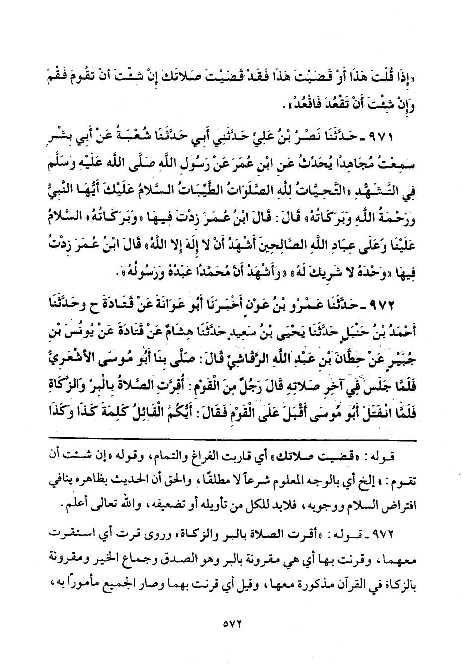 972 - حَدَّثَنَا عَمْرُو بْنُ عَوْنٍ، أَخْبَرَنَا أَبُو عَوَانَةَ، عَنْ قَتَادَةَ، ح وحَدَّثَنَا أَحْمَدُ بْنُ حَنْبَلٍ، حَدَّثَنَا يَحْيَى بْنُ سَعِيدٍ، حَدَّثَنَا هِشَامٌ، عَنْ قَتَادَةَ، عَنْ يُونُسَ بْنِ جُبَيْرٍ، عَنْ حِطَّانَ بْنِ عَبْدِ اللَّهِ الرَّقَاشِيِّ، قَالَ: صَلَّى بِنَا أَبُو مُوسَى الْأَشْعَرِيُّ، فَلَمَّا جَلَسَ فِي آخِرِ صَلَاتِهِ، قَالَ رَجُلٌ مِنَ الْقَوْمِ: أُقِرَّتِ الصَّلَاةُ بِالْبِرِّ، وَالزَّكَاةِ، فَلَمَّا انْفَتَلَ أَبُو مُوسَى أَقْبَلَ عَلَى الْقَوْمِ، فَقَالَ: أَيُّكُمُ الْقَائِلُ كَلِمَةَ كَذَا وَكَذَا؟ قَالَ: فَأَرَمَّ الْقَوْمُ، فَقَالَ: أَيُّكُمُ الْقَائِلُ كَلِمَةَ كَذَا وَكَذَا؟