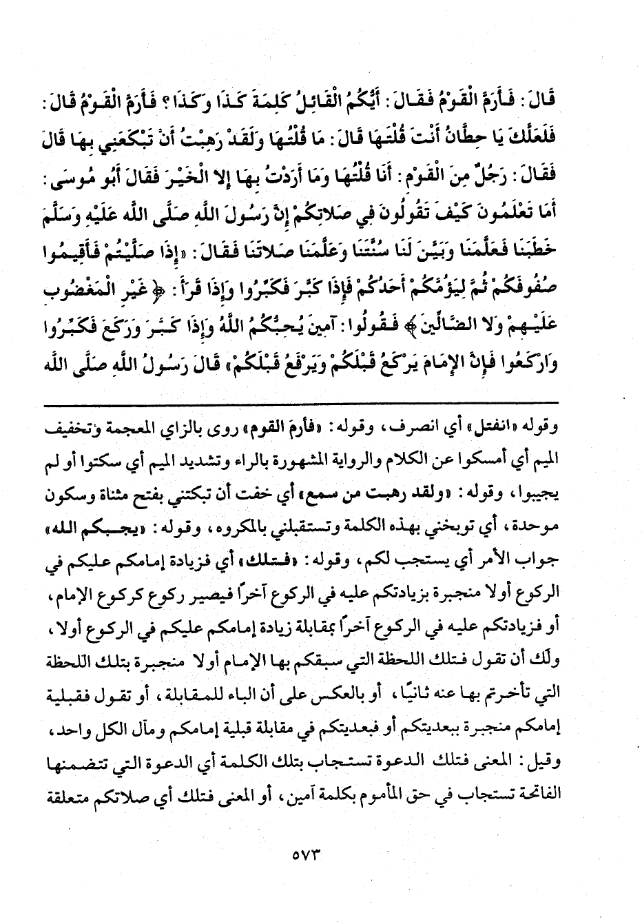 فَأَرَمَّ الْقَوْمُ، قَالَ: فَلَعَلَّكَ يَا حِطَّانُ أَنْتَ قُلْتَهَا، قَالَ: مَا قُلْتُهَا، وَلَقَدْ رَهِبْتُ أَنْ تَبْكَعَنِي بِهَا، قَالَ: فَقَالَ رَجُلٌ مِنَ الْقَوْمِ: أَنَا قُلْتُهَا وَمَا أَرَدْتُ بِهَا إِلَّا الْخَيْرَ، فَقَالَ أَبُو مُوسَى: أَمَا تَعْلَمُونَ كَيْفَ تَقُولُونَ فِي صَلَاتِكُمْ، إِنَّ رَسُولَ اللَّهِ صَلَّى اللهُ عَلَيْهِ وَسَلَّمَ خَطَبَنَا، فَعَلَّمَنَا وَبَيَّنَ لَنَا سُنَّتَنَا، وَعَلَّمَنَا صَلَاتَنَا، فَقَالَ: " إِذَا صَلَّيْتُمْ فَأَقِيمُوا صُفُوفَكُمْ، ثُمَّ لِيَؤُمَّكُمْ أَحَدُكُمْ، فَإِذَا كَبَّرَ فَكَبِّرُوا، وَإِذَا قَرَأَ {غَيْرِ الْمَغْضُوبِ عَلَيْهِمْ وَلَا الضَّالِّينَ} [الفاتحة: 7]، فَقُولُوا: آمِينَ يُحِبُّكُمُ اللَّهُ، وَإِذَا كَبَّرَ وَرَكَعَ، فَكَبِّرُوا وَارْكَعُوا، فَإِنَّ الْإِمَامَ يَرْكَعُ قَبْلَكُمْ وَيَرْفَعُ قَبْلَكُمْ "، قَالَ رَسُولُ اللَّهِ صَلَّى اللهُ